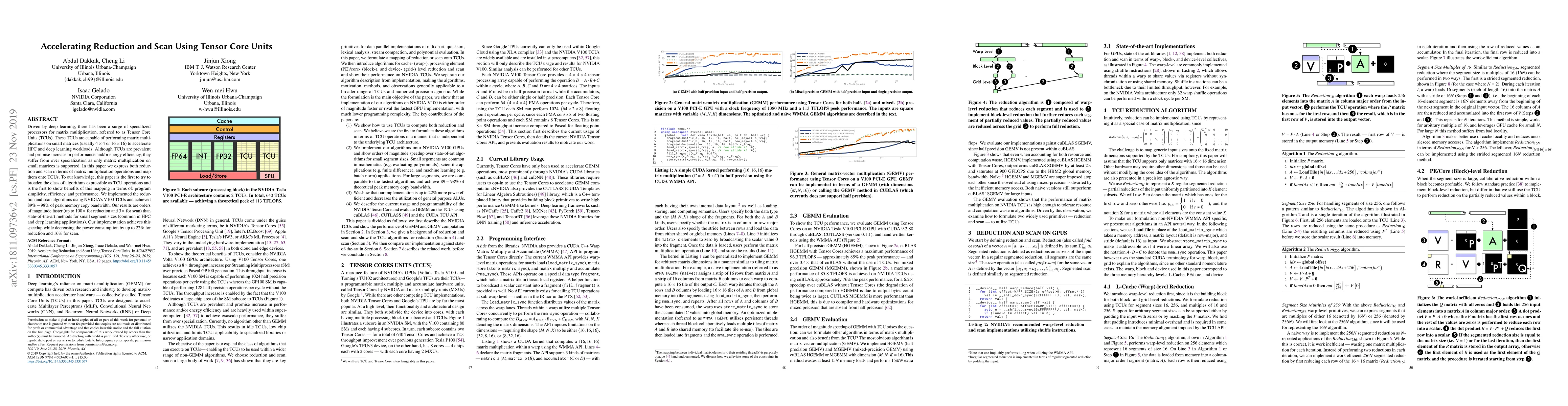 This work is the first to formulate reduction and scan algorithms in terms of matrix multiplications to exercise TCUs, unlike previous hardware-specific designs for reduction and scan hardware.