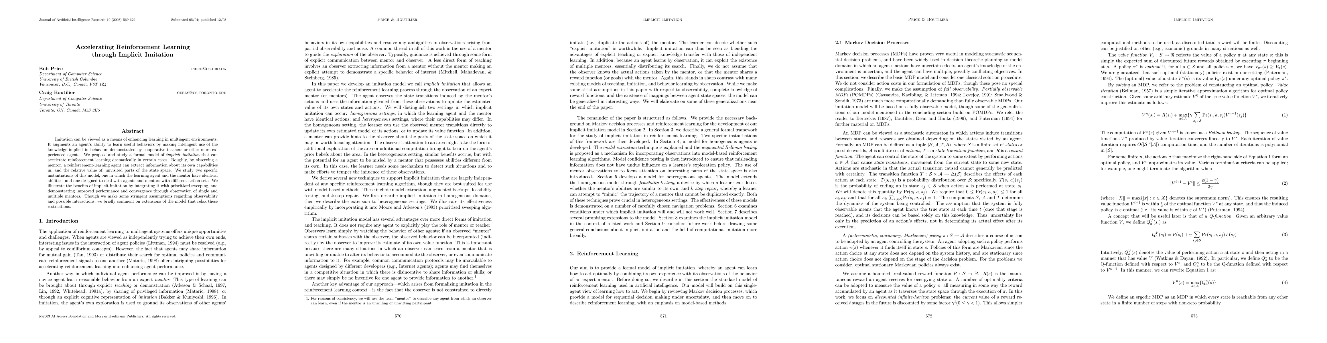 This paper proposes a model of implicit imitation to accelerate reinforcement learning by leveraging the knowledge demonstrated by mentor agents. It shows improved performance and convergence through the observation of mentors, even in environments with different action sets, and discusses potential extensions to relax current assumptions.