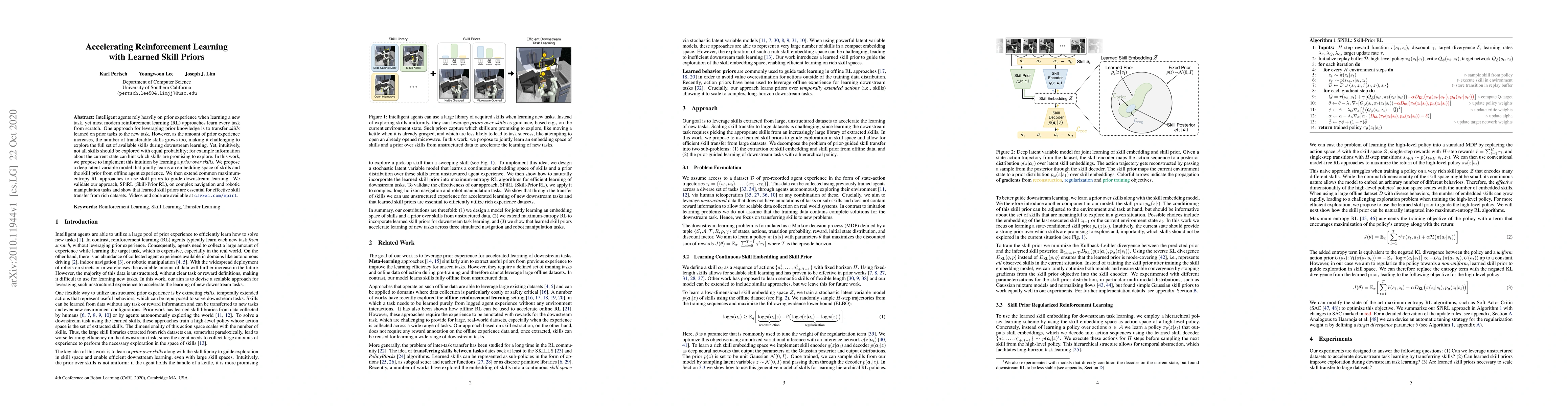 This paper proposes SPiRL, a method that leverages learned skill priors to accelerate reinforcement learning by transferring skills from prior experiences. It uses a deep latent variable model to learn an embedding space of skills and a skill prior, guiding downstream learning effectively in navigation and robotic manipulation tasks.