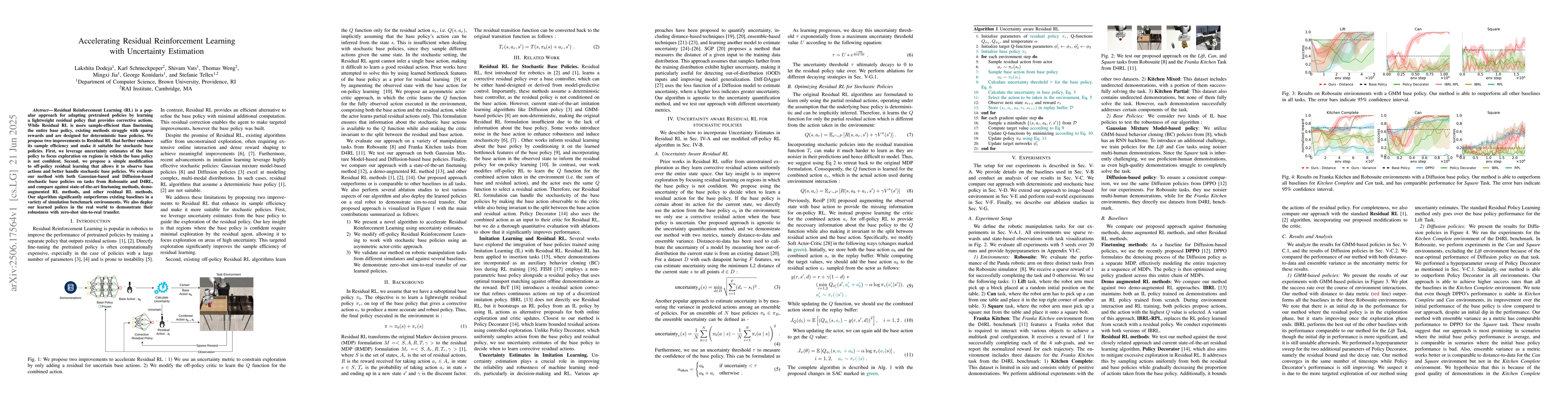 Residual Reinforcement Learning (RL) is a popular approach for adapting pretrained policies by learning a lightweight residual policy that provides corrective actions. While Residual RL is more sample-efficient than finetuning the entire base policy, existing methods struggle with sparse rewards and are designed for deterministic base policies. We propose two improvements to Residual RL that further enhance its sample efficiency and make it suitable for stochastic base policies. First, we leverage uncertainty estimates of the base policy to focus exploration on regions in which the base policy is not confident. Second, we propose a simple modification to off-policy residual learning that allows it to observe base actions and better handle stochastic base policies. We evaluate our method with both Gaussian-based and Diffusion-based stochastic base policies on tasks from Robosuite and D4RL, and compare against state-of-the-art finetuning methods, demo-augmented RL methods, and other residual RL methods. Our algorithm significantly outperforms existing baselines in a variety of simulation benchmark environments. We also deploy our learned polices in the real world to demonstrate their robustness with zero-shot sim-to-real transfer.