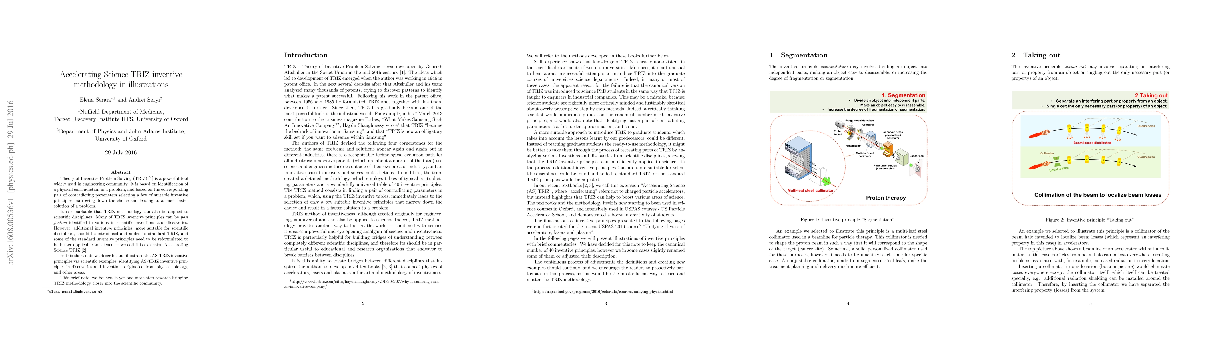 Theory of Inventive Problem Solving (TRIZ) is a powerful tool widely used in engineering community. It is based on identification of a physical contradiction in a problem, and based on the corresponding pair of contradicting parameters selecting a few of suitable inventive principles, narrowing down the choice and leading to a much faster solution of a problem. It is remarkable that TRIZ methodology can also be applied to scientific disciplines. Many of TRIZ inventive principles can be post factum identified in various in scientific inventions and discoveries. However, additional inventive principles, more suitable for scientific disciplines, should be introduced and added to standard TRIZ, and some of the standard inventive principles need to be reformulated to be better applicable to science - we call this extension Accelerating Science TRIZ. In this short note we describe and illustrate the AS-TRIZ inventive principles via scientific examples, identifying AS-TRIZ inventive principles in discoveries and inventions originated from physics, biology, and other areas. This brief note, we believe, is yet one more step towards bringing TRIZ methodology closer into the scientific community.