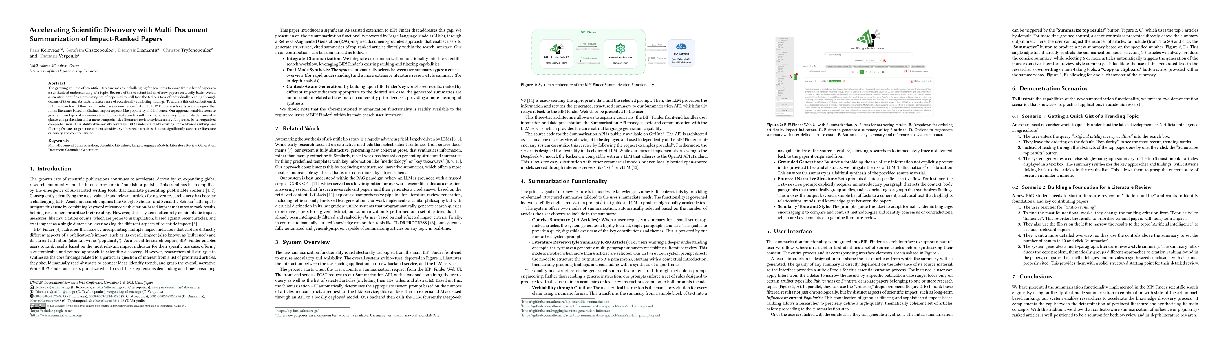 The growing volume of scientific literature makes it challenging for scientists to move from a list of papers to a synthesized understanding of a topic. Because of the constant influx of new papers on a daily basis, even if a scientist identifies a promising set of papers, they still face the tedious task of individually reading through dozens of titles and abstracts to make sense of occasionally conflicting findings. To address this critical bottleneck in the research workflow, we introduce a summarization feature to BIP! Finder, a scholarly search engine that ranks literature based on distinct impact aspects like popularity and influence. Our approach enables users to generate two types of summaries from top-ranked search results: a concise summary for an instantaneous at-a-glance comprehension and a more comprehensive literature review-style summary for greater, better-organized comprehension. This ability dynamically leverages BIP! Finder's already existing impact-based ranking and filtering features to generate context-sensitive, synthesized narratives that can significantly accelerate literature discovery and comprehension.