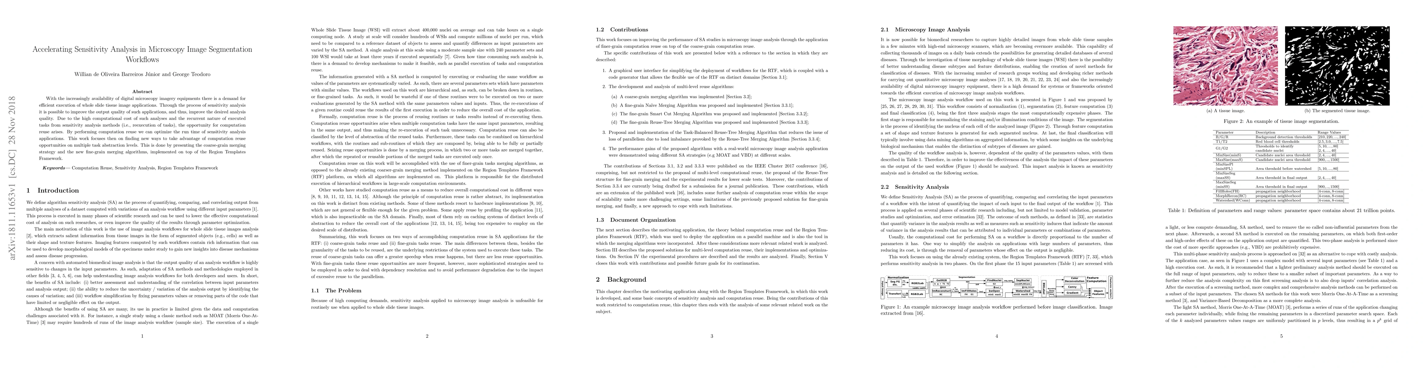 With the increasingly availability of digital microscopy imagery equipments there is a demand for efficient execution of whole slide tissue image applications. Through the process of sensitivity analysis it is possible to improve the output quality of such applications, and thus, improve the desired analysis quality. Due to the high computational cost of such analyses and the recurrent nature of executed tasks from sensitivity analysis methods (i.e., reexecution of tasks), the opportunity for computation reuse arises. By performing computation reuse we can optimize the run time of sensitivity analysis applications. This work focuses then on finding new ways to take advantage of computation reuse opportunities on multiple task abstraction levels. This is done by presenting the coarse-grain merging strategy and the new fine-grain merging algorithms, implemented on top of the Region Templates Framework.