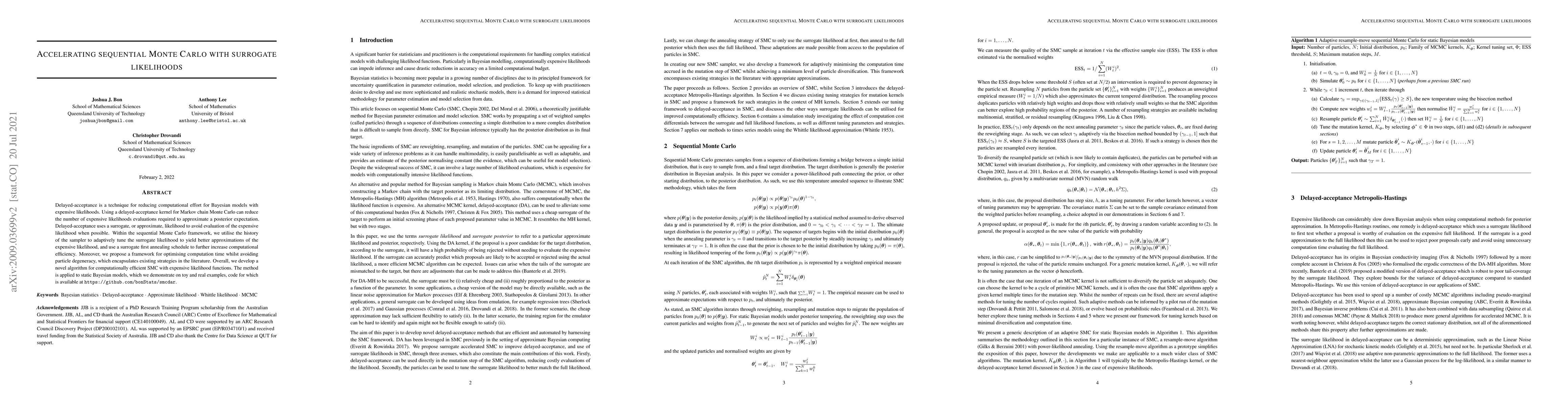 This paper proposes a novel delayed-acceptance technique within the sequential Monte Carlo framework to reduce computational effort for expensive likelihood evaluations in Bayesian models. The method adaptively tunes surrogate likelihoods and uses a surrogate first annealing schedule, optimizing computation time while avoiding particle degeneracy.
