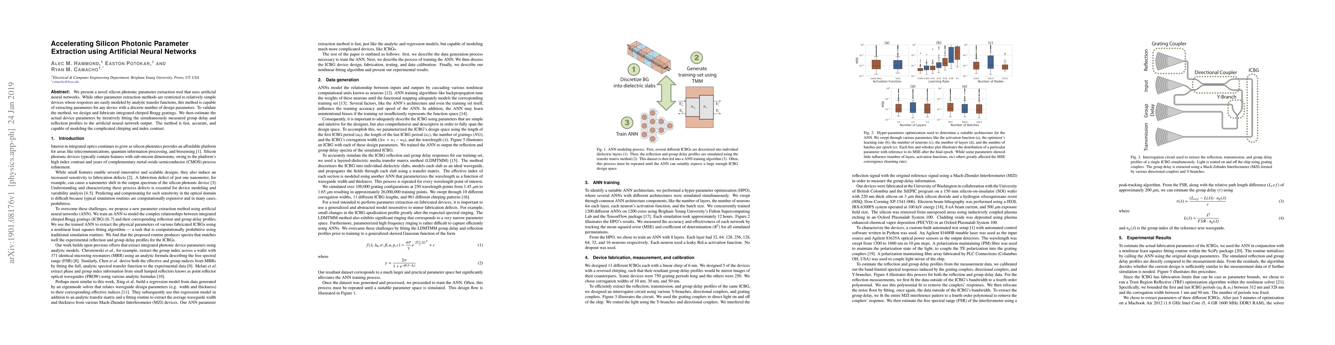 This paper introduces a novel method for silicon photonic parameter extraction using artificial neural networks, which can handle complex devices beyond simple analytic models. The method is validated through the design and fabrication of integrated chirped Bragg gratings, demonstrating its accuracy and speed in modeling intricate device characteristics.