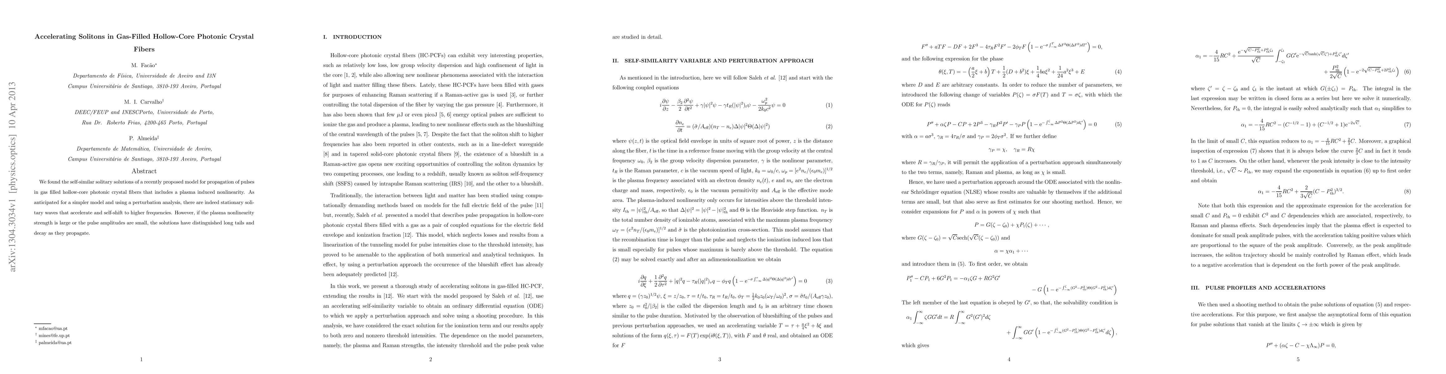 This research explores soliton propagation in gas-filled hollow-core photonic crystal fibers, revealing self-similar accelerating solitary waves with frequency shifts. However, strong plasma nonlinearity or small pulse amplitudes lead to solutions with long tails and decay over distance.