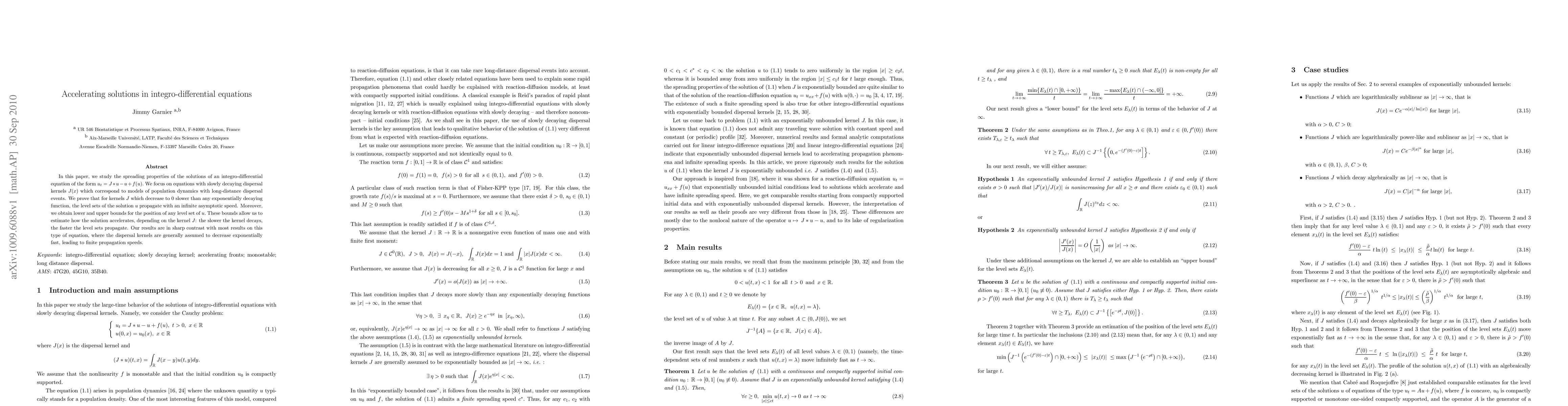 In this paper, we study the spreading properties of the solutions of an integro-differential equation of the form $u_t=J\ast u-u+f(u).$ We focus on equations with slowly decaying dispersal kernels $J(x)$ which correspond to models of population dynamics with long-distance dispersal events. We prove that for kernels $J$ which decrease to $0$ slower than any exponentially decaying function, the level sets of the solution $u$ propagate with an infinite asymptotic speed. Moreover, we obtain lower and upper bounds for the position of any level set of $u.$ These bounds allow us to estimate how the solution accelerates, depending on the kernel $J$: the slower the kernel decays, the faster the level sets propagate. Our results are in sharp contrast with most results on this type of equation, where the dispersal kernels are generally assumed to decrease exponentially fast, leading to finite propagation speeds.