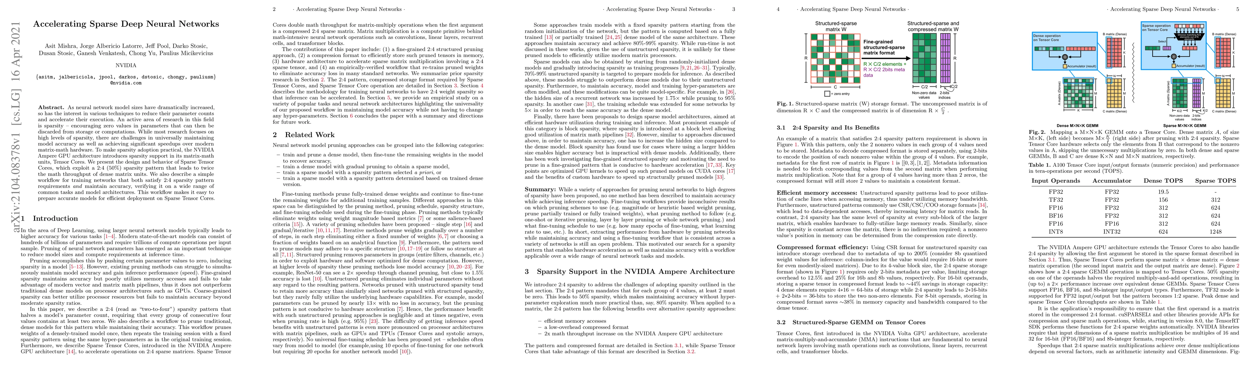 As neural network model sizes have dramatically increased, so has the interest in various techniques to reduce their parameter counts and accelerate their execution. An active area of research in this field is sparsity - encouraging zero values in parameters that can then be discarded from storage or computations. While most research focuses on high levels of sparsity, there are challenges in universally maintaining model accuracy as well as achieving significant speedups over modern matrix-math hardware. To make sparsity adoption practical, the NVIDIA Ampere GPU architecture introduces sparsity support in its matrix-math units, Tensor Cores. We present the design and behavior of Sparse Tensor Cores, which exploit a 2:4 (50%) sparsity pattern that leads to twice the math throughput of dense matrix units. We also describe a simple workflow for training networks that both satisfy 2:4 sparsity pattern requirements and maintain accuracy, verifying it on a wide range of common tasks and model architectures. This workflow makes it easy to prepare accurate models for efficient deployment on Sparse Tensor Cores.