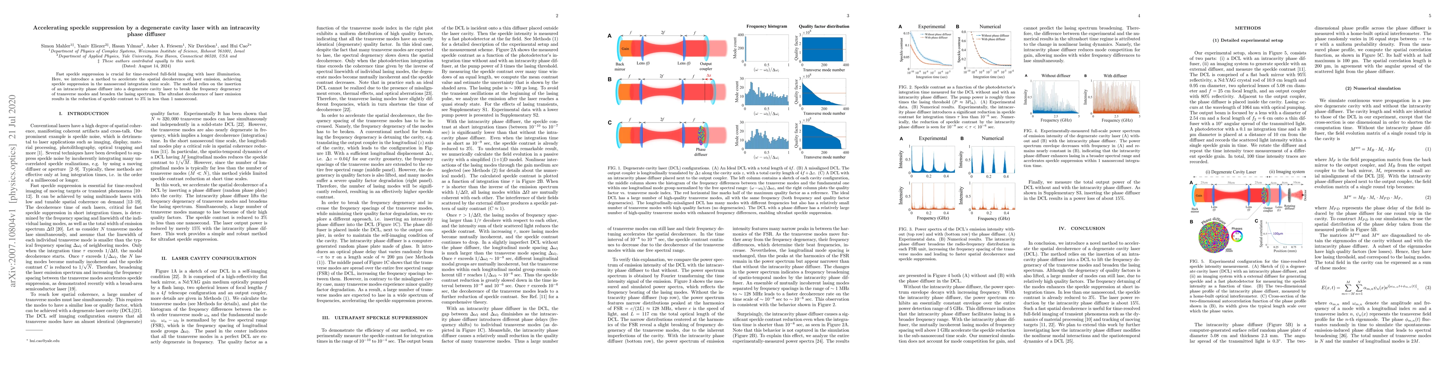 This paper presents a method for rapid speckle suppression using a degenerate cavity laser with an intracavity phase diffuser, achieving a reduction in speckle contrast to 3% within 1 nanosecond by breaking the frequency degeneracy of transverse modes and broadening the lasing spectrum. This technique is vital for time-resolved full-field imaging applications.