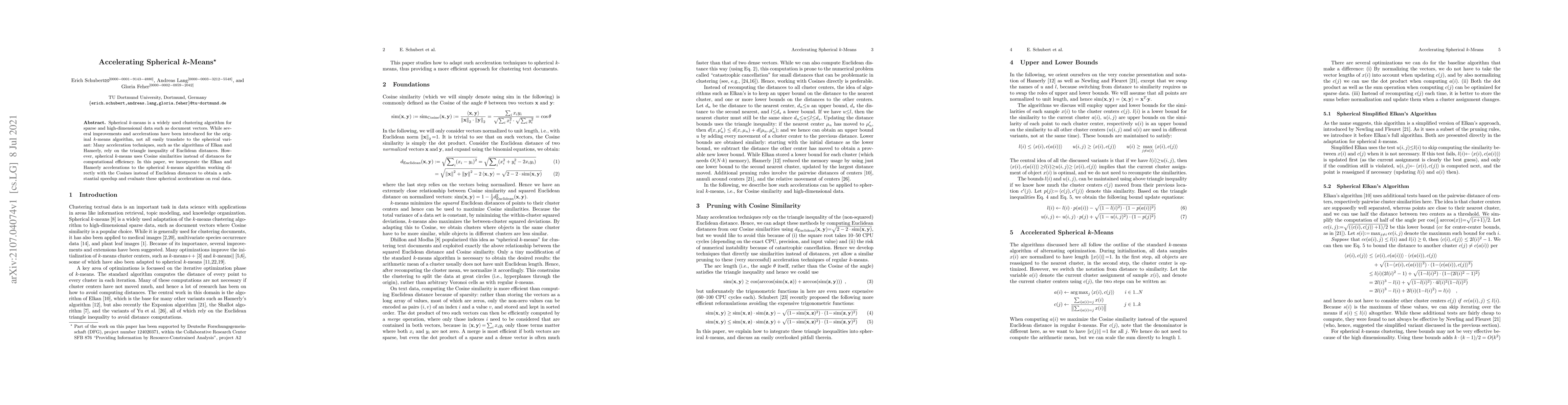 This paper proposes accelerated versions of the spherical k-means algorithm by adapting Euclidean distance-based acceleration techniques to work with cosine similarities, achieving significant speedups for clustering high-dimensional data. The effectiveness of these adaptations is demonstrated through evaluations on real datasets.
