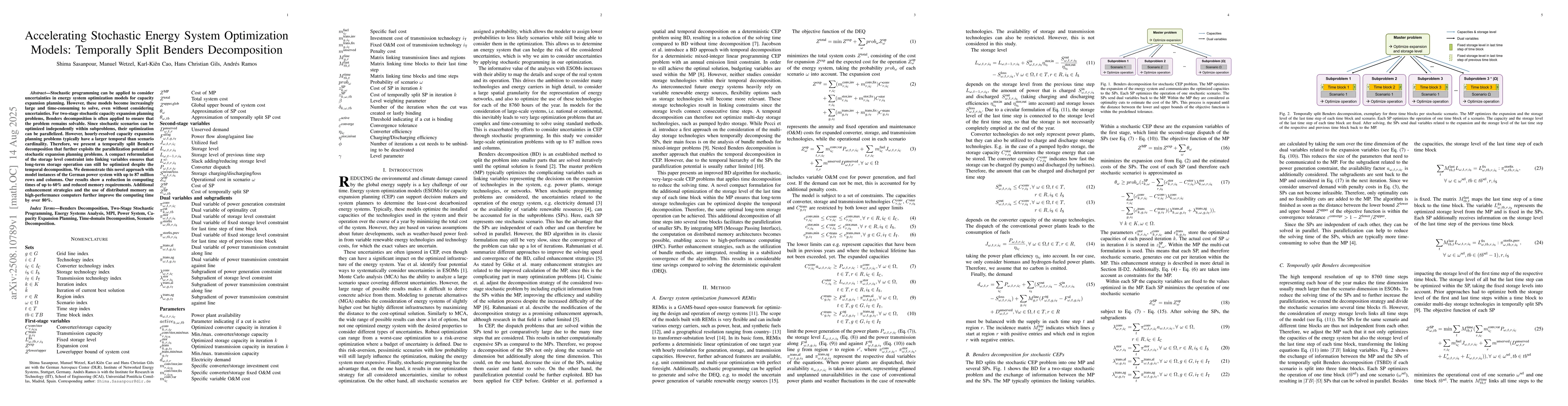 Stochastic programming can be applied to consider uncertainties in energy system optimization models for capacity expansion planning. However, these models become increasingly large and time-consuming to solve, even without considering uncertainties. For two-stage stochastic capacity expansion planning problems, Benders decomposition is often applied to ensure that the problem remains solvable. Since stochastic scenarios can be optimized independently within subproblems, their optimization can be parallelized. However, hourly-resolved capacity expansion planning problems typically have a larger temporal than scenario cardinality. Therefore, we present a temporally split Benders decomposition that further exploits the parallelization potential of stochastic expansion planning problems. A compact reformulation of the storage level constraint into linking variables ensures that long-term storage operation can still be optimized despite the temporal decomposition. We demonstrate this novel approach with model instances of the German power system with up to 87 million rows and columns. Our results show a reduction in computing times of up to 60% and reduced memory requirements. Additional enhancement strategies and the use of distributed memory on high-performance computers further improve the computing time by over 80%.