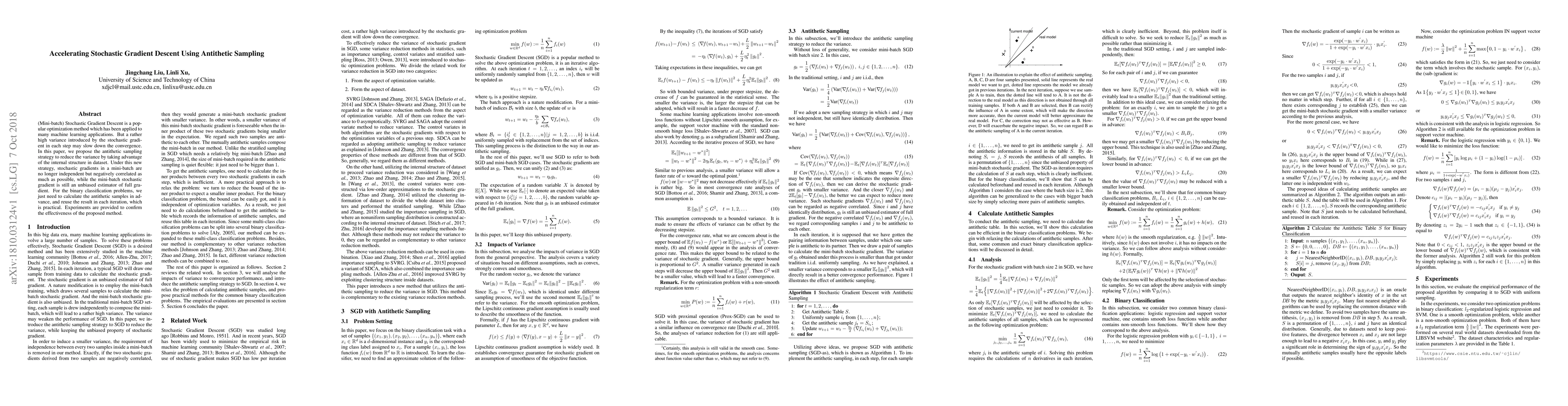 This paper proposes an antithetic sampling strategy to accelerate mini-batch Stochastic Gradient Descent by reducing variance through negatively correlated samples, maintaining unbiased gradient estimation. Practical implementation for binary classification is demonstrated through experiments confirming the method's effectiveness.