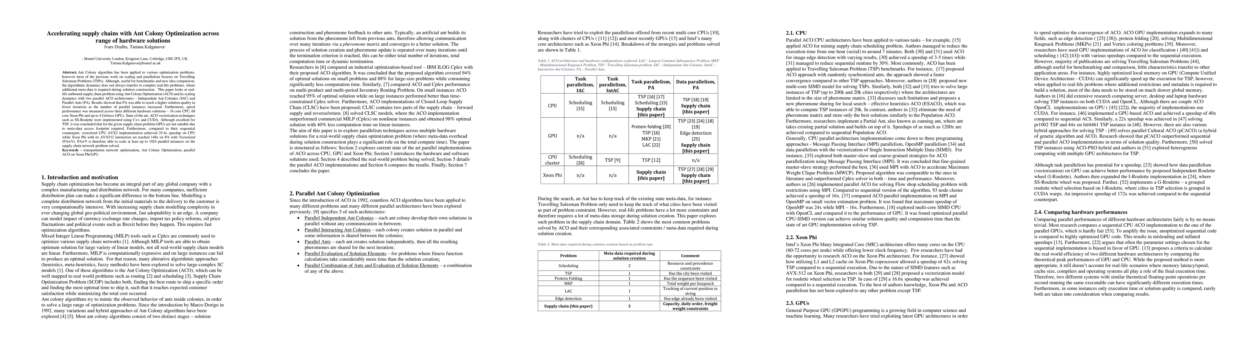 This paper explores the application of Ant Colony Optimization (ACO) to optimize real-life outbound supply chains, comparing two parallel architectures: Independent Ant Colonies and Parallel Ants. Results indicate that Parallel Ants achieve higher solution quality faster, especially with increased parallel instances. Performance was benchmarked across various hardware, showing significant speedups with vectorized CPU and Xeon Phi implementations, while GPUs were deemed unsuitable due to metadata access constraints.
