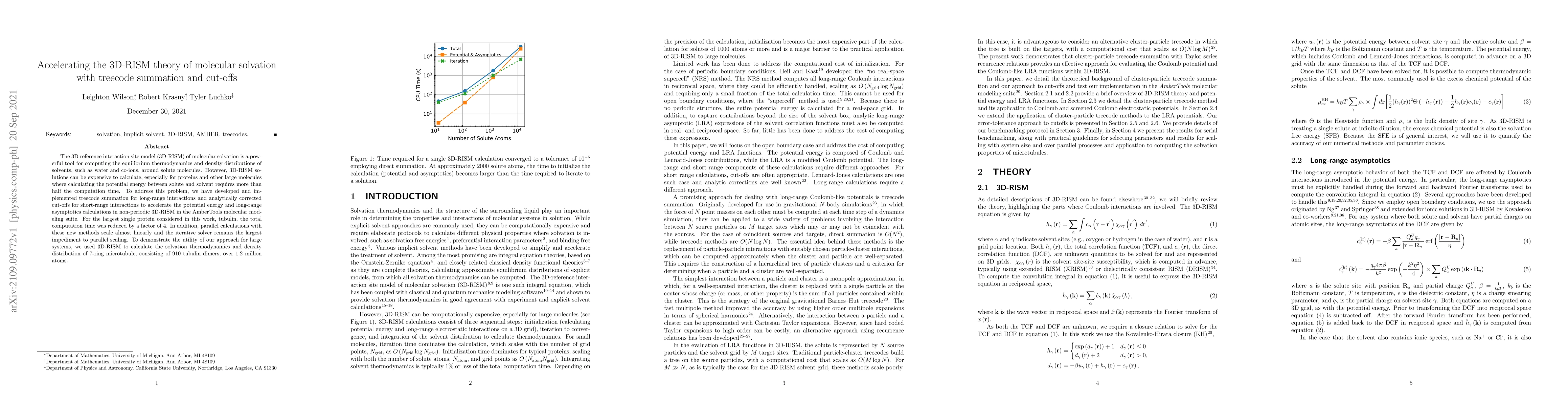 The 3D reference interaction site model (3D-RISM) of molecular solvation is a powerful tool for computing the equilibrium thermodynamics and density distributions of solvents, such as water and co-ions, around solute molecules. However, 3D-RISM solutions can be expensive to calculate, especially for proteins and other large molecules where calculating the potential energy between solute and solvent requires more than half the computation time. To address this problem, we have developed and implemented treecode summation for long-range interactions and analytically corrected cut-offs for short-range interactions to accelerate the potential energy and long-range asymptotics calculations in non-periodic 3D-RISM in the AmberTools molecular modeling suite. For the largest single protein considered in this work, tubulin, the total computation time was reduced by a factor of 4. In addition, parallel calculations with these new methods scale almost linearly and the iterative solver remains the largest impediment to parallel scaling. To demonstrate the utility of our approach for large systems, we used 3D-RISM to calculate the solvation thermodynamics and density distribution of 7-ring microtubule, consisting of 910 tubulin dimers, over 1.2 million atoms.