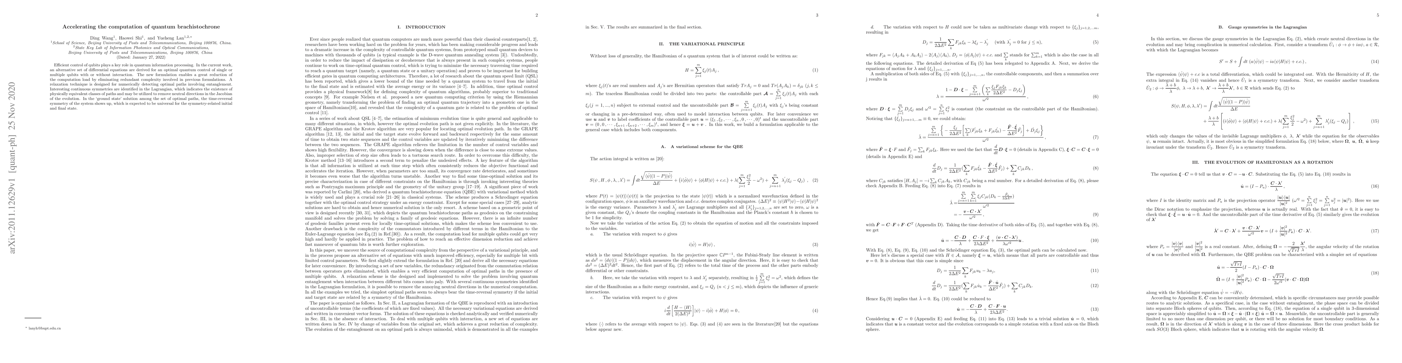 Efficient control of qubits plays a key role in quantum information processing. In the current work, an alternative set of differential equations are derived for an optimal quantum control of single or multiple qubits with or without interaction. The new formulation enables a great reduction of the computation load by eliminating redundant complexity involved in previous formulations. A relaxation technique is designed for numerically detecting optimal paths involving entanglement. Interesting continuous symmetries are identified in the Lagrangian, which indicates the existence of physically equivalent classes of paths and may be utilized to remove neutral directions in the Jacobian of the evolution. In the 'ground state' solution among the set of optimal paths, the time-reversal symmetry of the system shows up, which is expected to be universal for the symmetry-related initial and final state.
