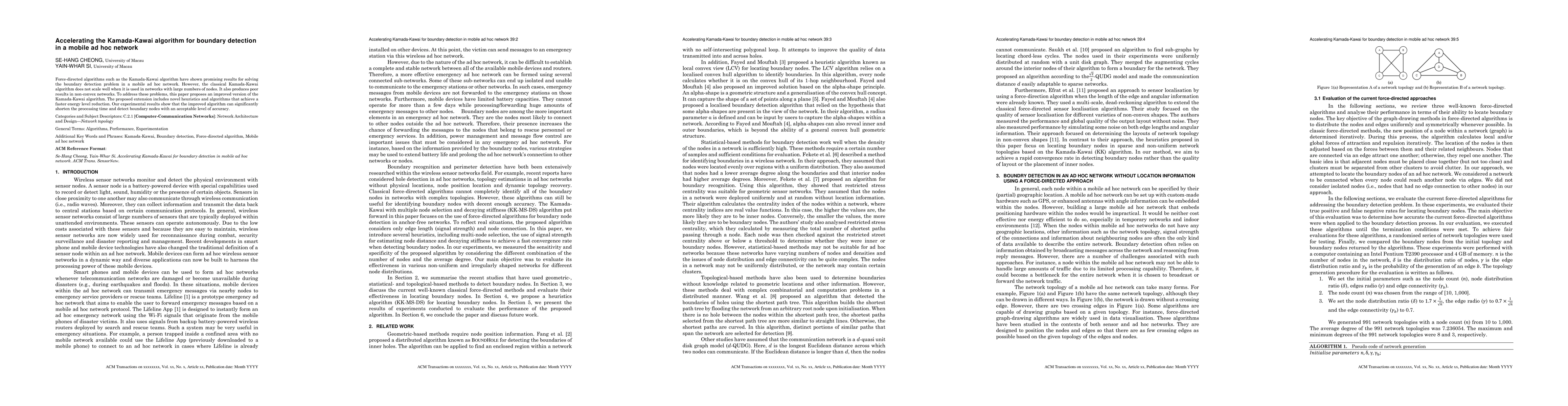 Force-directed algorithms such as the Kamada-Kawai algorithm have shown promising results for solving the boundary detection problem in a mobile ad hoc network. However, the classical Kamada-Kawai algorithm does not scale well when it is used in networks with large numbers of nodes. It also produces poor results in non-convex networks. To address these problems, this paper proposes an improved version of the Kamada-Kawai algorithm. The proposed extension includes novel heuristics and algorithms that achieve a faster energy level reduction. Our experimental results show that the improved algorithm can significantly shorten the processing time and detect boundary nodes with an acceptable level of accuracy.
