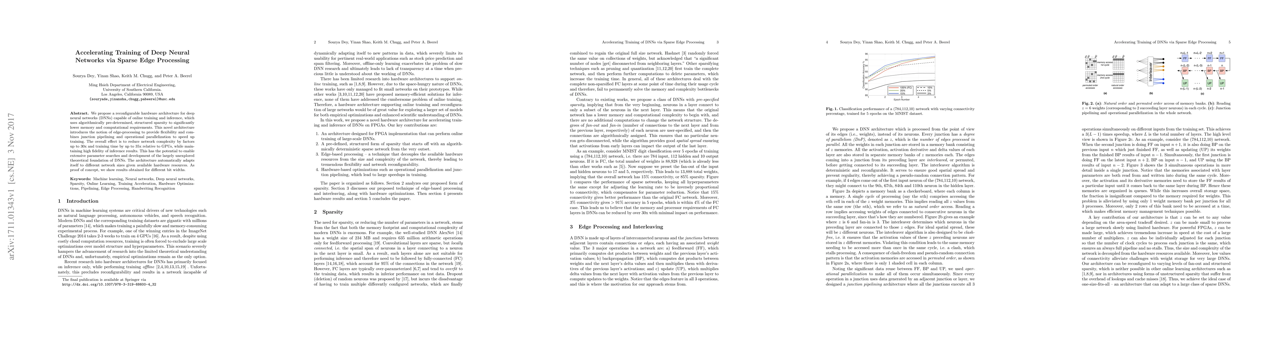 We propose a reconfigurable hardware architecture for deep neural networks (DNNs) capable of online training and inference, which uses algorithmically pre-determined, structured sparsity to significantly lower memory and computational requirements. This novel architecture introduces the notion of edge-processing to provide flexibility and combines junction pipelining and operational parallelization to speed up training. The overall effect is to reduce network complexity by factors up to 30x and training time by up to 35x relative to GPUs, while maintaining high fidelity of inference results. This has the potential to enable extensive parameter searches and development of the largely unexplored theoretical foundation of DNNs. The architecture automatically adapts itself to different network sizes given available hardware resources. As proof of concept, we show results obtained for different bit widths.