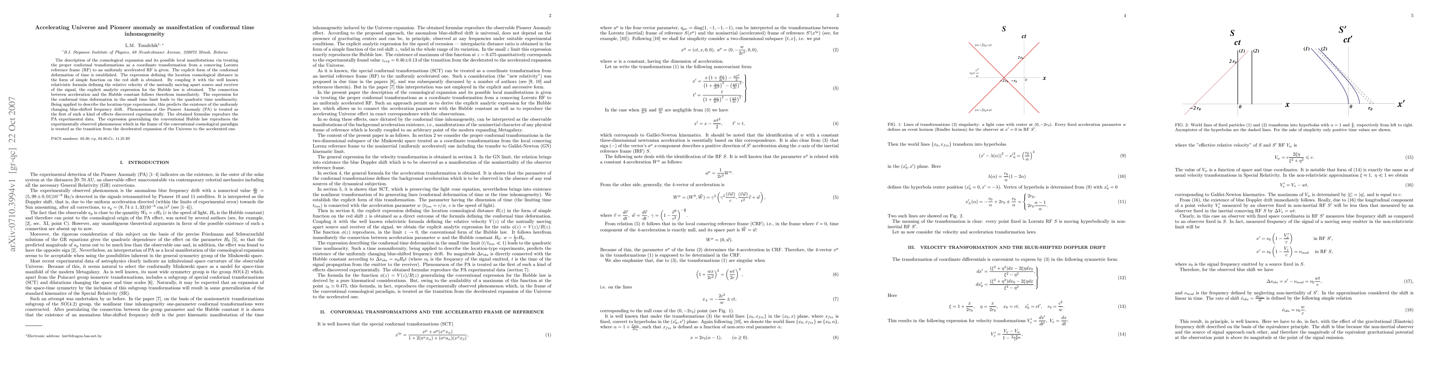 The description of the cosmological expansion and its possible local manifestations via treating the proper conformal transformations as a coordinate transformation from a comoving Lorentz reference frame (RF) to an uniformly accelerated RF is given. The explicit form of the conformal deformation of time is established. The expression defining the location cosmological distance in the form of simple function on the red shift is obtained. By coupling it with the well known relativistic formula defining the relative velocity of the mutually moving apart source and receiver of the signal, the explicit analytic expression for the Hubble law is obtained. The connection between acceleration and the Hubble constant follows therefrom immediately. The expression for the conformal time deformation in the small time limit leads to the quadratic time nonlinearity. Being applied to describe the location-type experiments, this predicts the existence of the uniformly changing blue-shifted frequency drift. Phenomenon of the Pioneer Anomaly (PA) is treated as the first of such a kind of effects discovered experimentally. The obtained formulae reproduce the PA experimental data. The expression generalizing the conventional Hubble law reproduces the experimentally observed phenomenon which in the frame of the conventional cosmological paradigm is treated as the transition from the decelerated expansion of the Universe to the accelerated one.