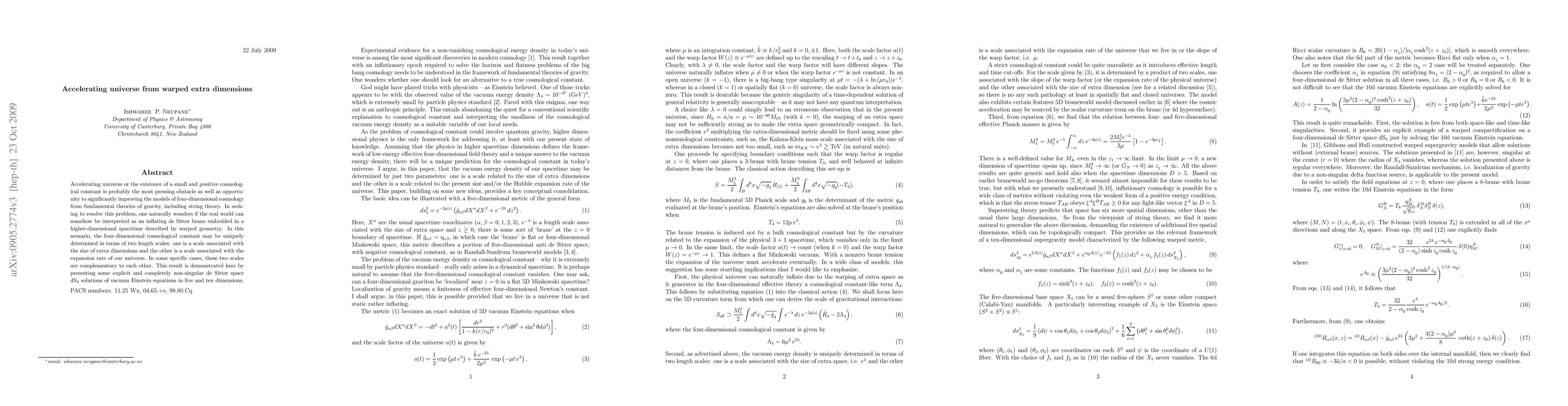 This paper explores how the accelerating universe could be explained by a four-dimensional de Sitter brane embedded in a higher-dimensional warped spacetime, with the cosmological constant determined by the size of extra dimensions and the universe's expansion rate. Explicit solutions of vacuum Einstein equations in five and ten dimensions support this scenario.