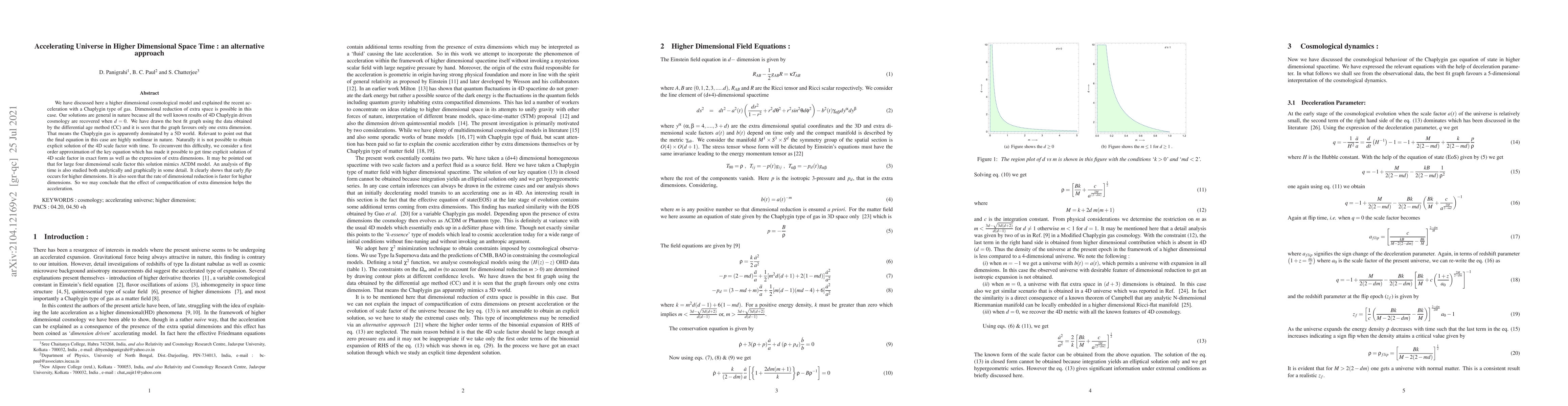 This paper proposes a higher-dimensional cosmological model explaining the universe's acceleration using a Chaplygin gas, suggesting that dimensional reduction in extra space is feasible. The model favors a 5D universe, with the 4D scale factor solution approximated for large-scale factors, mimicking the $\Lambda$CDM model.