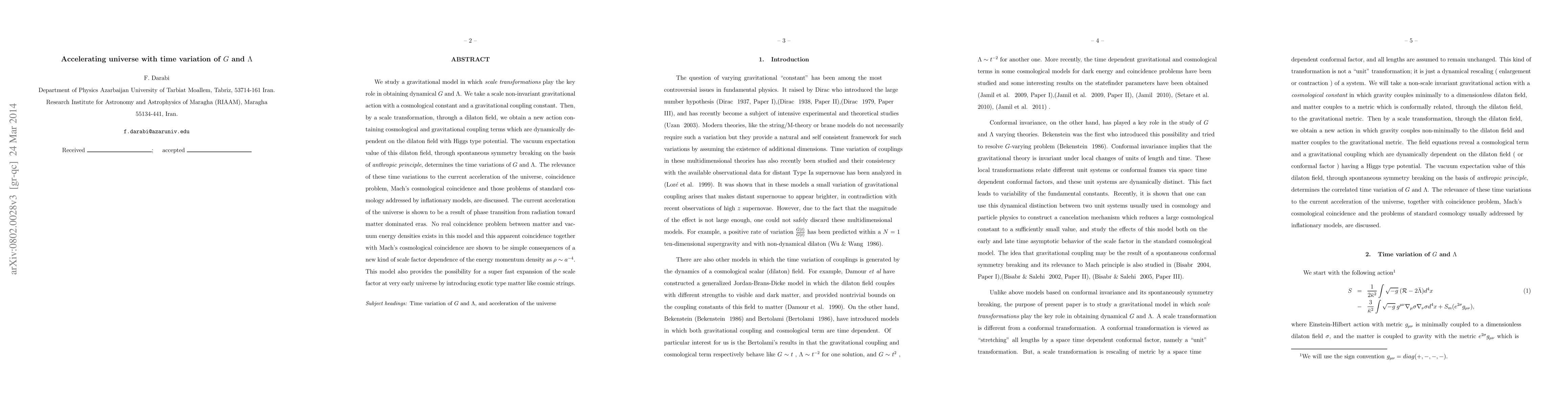 This research paper proposes a model where the gravitational constant G and cosmological constant Lambda vary with time due to spontaneous symmetry breaking in a dilaton field, addressing issues like universe acceleration and coincidence problem.