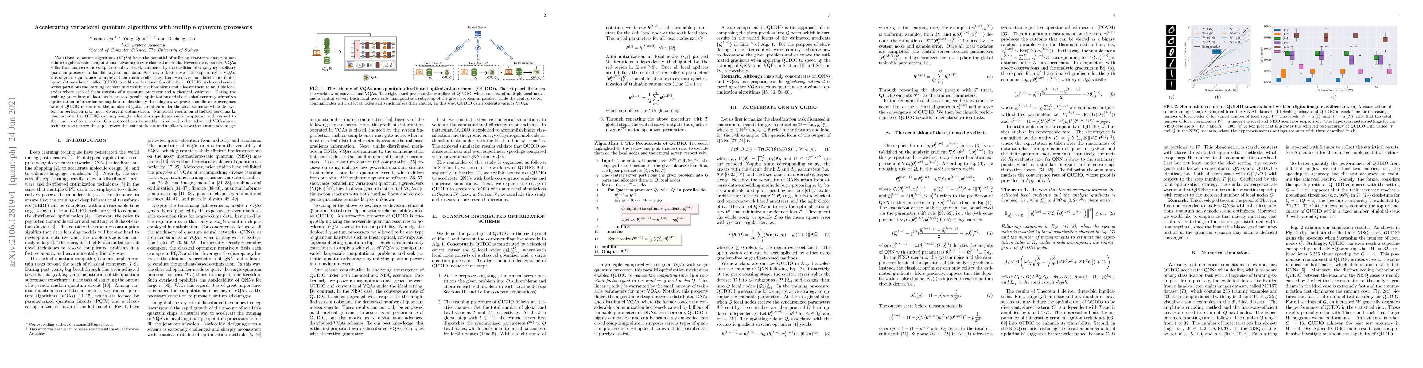Variational quantum algorithms (VQAs) have the potential of utilizing near-term quantum machines to gain certain computational advantages over classical methods. Nevertheless, modern VQAs suffer from cumbersome computational overhead, hampered by the tradition of employing a solitary quantum processor to handle large-volume data. As such, to better exert the superiority of VQAs, it is of great significance to improve their runtime efficiency. Here we devise an efficient distributed optimization scheme, called QUDIO, to address this issue. Specifically, in QUDIO, a classical central server partitions the learning problem into multiple subproblems and allocate them to multiple local nodes where each of them consists of a quantum processor and a classical optimizer. During the training procedure, all local nodes proceed parallel optimization and the classical server synchronizes optimization information among local nodes timely. In doing so, we prove a sublinear convergence rate of QUDIO in terms of the number of global iteration under the ideal scenario, while the system imperfection may incur divergent optimization. Numerical results on standard benchmarks demonstrate that QUDIO can surprisingly achieve a superlinear runtime speedup with respect to the number of local nodes. Our proposal can be readily mixed with other advanced VQAs-based techniques to narrow the gap between the state of the art and applications with quantum advantage.