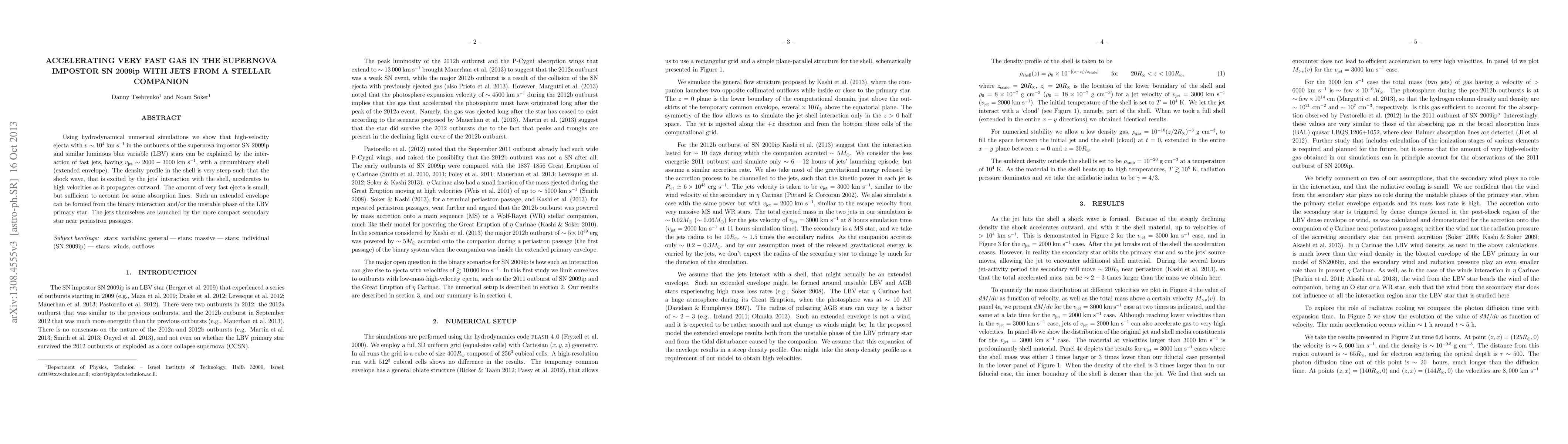 Using hydrodynamical numerical simulations we show that high-velocity ejecta with 10,000 km/s in the outbursts of the supernova impostor SN 2009ip and similar luminous blue variable (LBV) stars can be explained by the interaction of fast jets, having velocity of 2000-3000 km/s, with a circumbinary shell (extended envelope). The density profile in the shell is very steep such that the shock wave, that is excited by the jets' interaction with the shell, accelerates to high velocities as it propagates outward. The amount of very fast ejecta is small, but sufficient to account for some absorption lines. Such an extended envelope can be formed from the binary interaction and/or the unstable phase of the LBV primary star. The jets themselves are launched by the more compact secondary star near periastron passages.