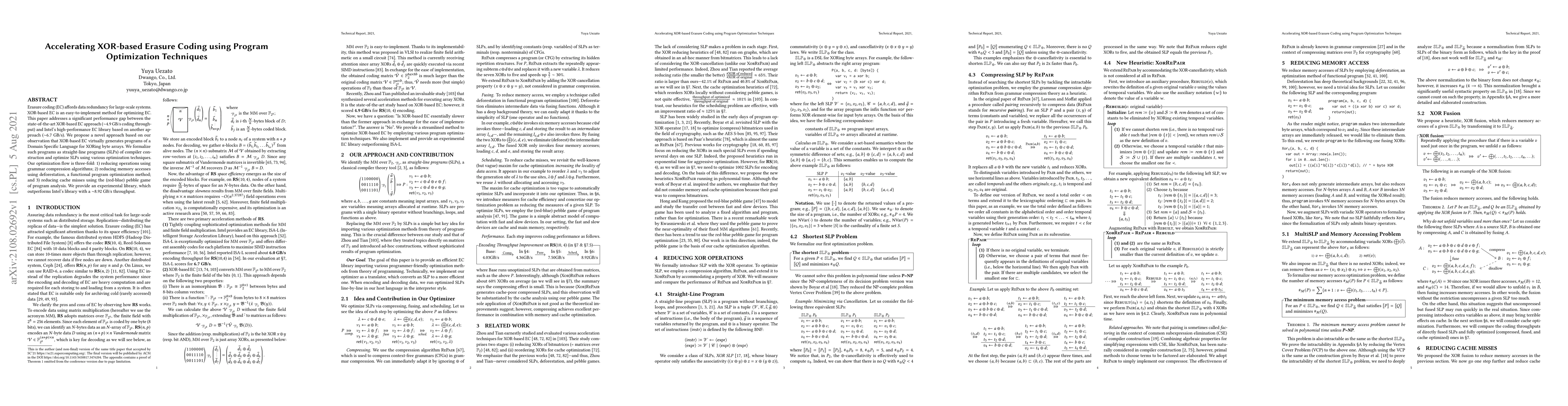 This paper proposes a novel optimization approach for XOR-based erasure coding, achieving a throughput of 8.92 GB/s by leveraging program optimization techniques such as grammar compression, deforestation, and cache miss reduction. The optimized library outperforms Intel's high-performance EC library, bridging the performance gap.
