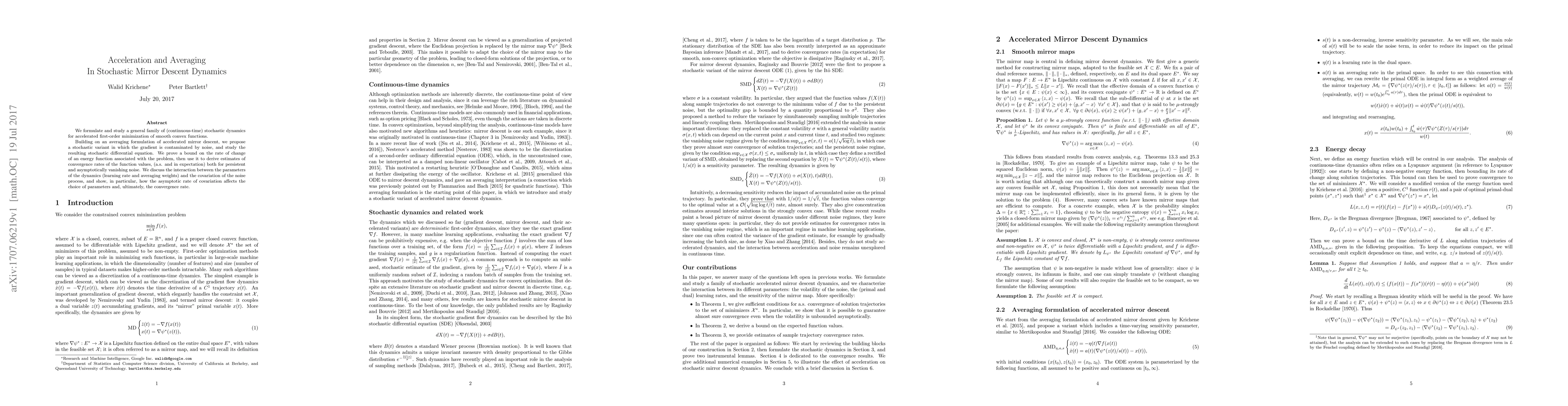 We formulate and study a general family of (continuous-time) stochastic dynamics for accelerated first-order minimization of smooth convex functions. Building on an averaging formulation of accelerated mirror descent, we propose a stochastic variant in which the gradient is contaminated by noise, and study the resulting stochastic differential equation. We prove a bound on the rate of change of an energy function associated with the problem, then use it to derive estimates of convergence rates of the function values, (a.s. and in expectation) both for persistent and asymptotically vanishing noise. We discuss the interaction between the parameters of the dynamics (learning rate and averaging weights) and the covariation of the noise process, and show, in particular, how the asymptotic rate of covariation affects the choice of parameters and, ultimately, the convergence rate.
