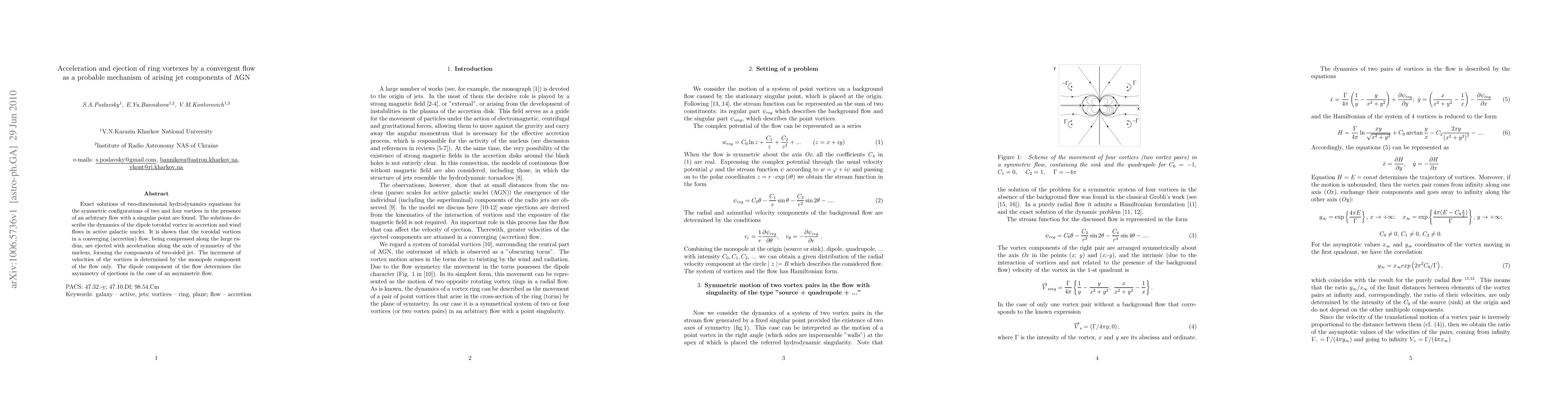 Exact solutions of two-dimensional hydrodynamics equations for the symmetric configurations of two and four vortices in the presence of an arbitrary flow with a singular point are found. The solutions describe the dynamics of the dipole toroidal vortex in accretion and wind flows in active galactic nuclei. It is shown that the toroidal vortices in a converging (accretion) flow, being compressed along the large radius, are ejected with acceleration along the axis of symmetry of the nucleus, forming the components of two-sided jet. The increment of velocities of the vortices is determined by the monopole component of the flow only. The dipole component of the flow determines the asymmetry of ejections in the case of an asymmetric flow.
