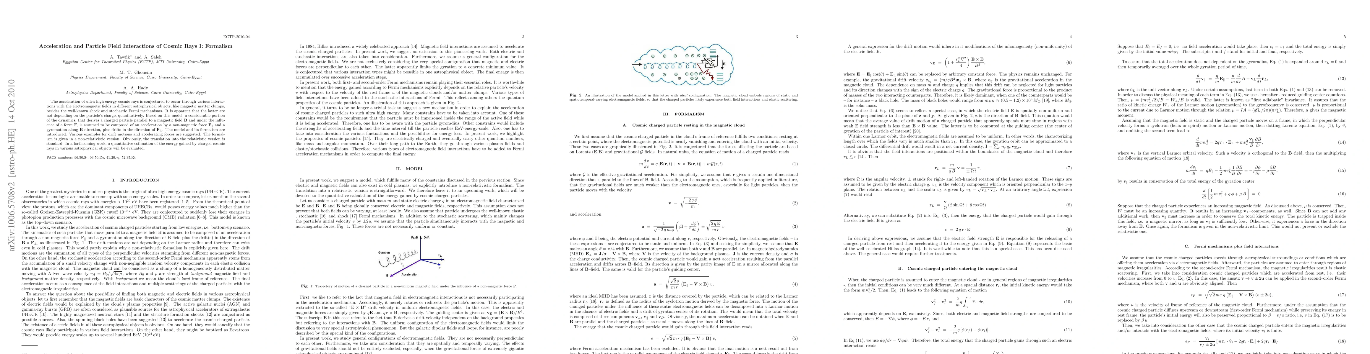 The acceleration of ultra high energy cosmic rays is conjectured to occur through various interactions with the electromagnetic fields in different astrophysical objects, like magnetic matter clumps, besides the well-known shock and stochastic Fermi mechanisms. It is apparent that the latter are not depending on the particle's charge, quantitatively. Based on this model, a considerable portion of the dynamics, that derives a charged particle parallel to a magnetic field $\mathbf{B}$ and under the influence of a force $\mathbf{F}$, is assumed to be composed of an acceleration by a non-magnetic force $\mathbf{F}_{\parallel}$ and a gyromotion along $\mathbf{B}$ direction, plus drifts in the direction of $\mathbf{F}_{\perp}$. The model and its formalism are introduced. Various examples for drift motions and accelerating forces are suggested. The formalism is given in a non-relativistic version. Obviously, the translation into the relativistic version is standard. In a forthcoming work, a quantitative estimation of the energy gained by charged cosmic rays in various astrophysical objects will be evaluated.