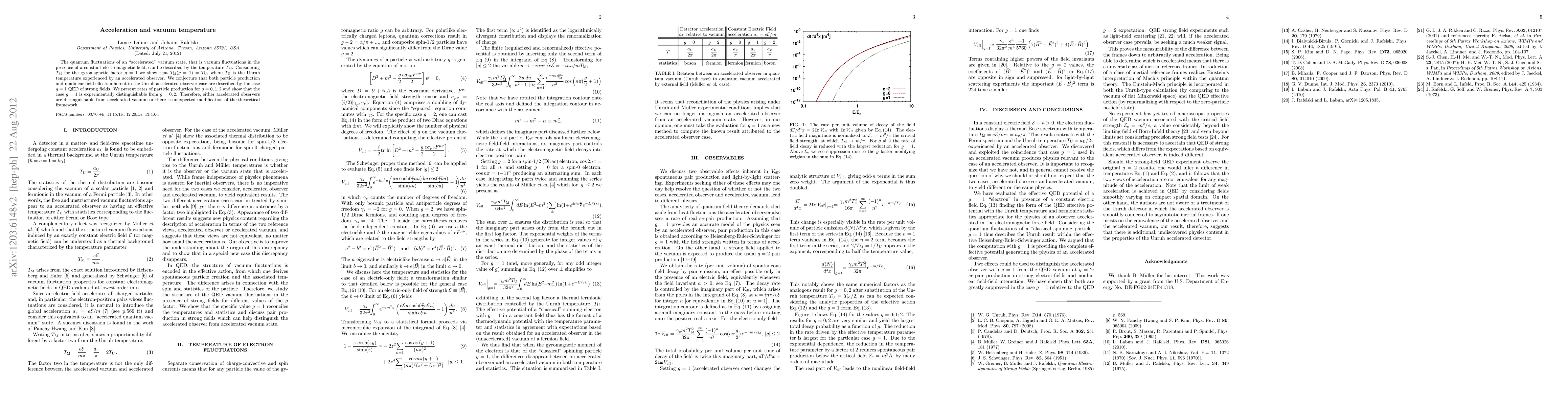The quantum fluctuations of an "accelerated" vacuum state, that is vacuum fluctuations in the presence of a constant electromagnetic field, can be described by the temperature $\TEH$. Considering $\TEH$ for the gyromagnetic factor $g=1$ we show that $\TEH(g=1)=\THU$, where $\THU$ is the Unruh temperature experienced by an accelerated observer. We conjecture that both particle production and nonlinear field effects inherent in the Unruh accelerated observer case are described by the case $g=1$ QED of strong fields. We present rates of particle production for $g=0,1,2$ and show that the case $g=1$ is experimentally distinguishable from $g=0,2$. Therefore, either accelerated observers are distinguishable from accelerated vacuum or there is unexpected modification of the theoretical framework.