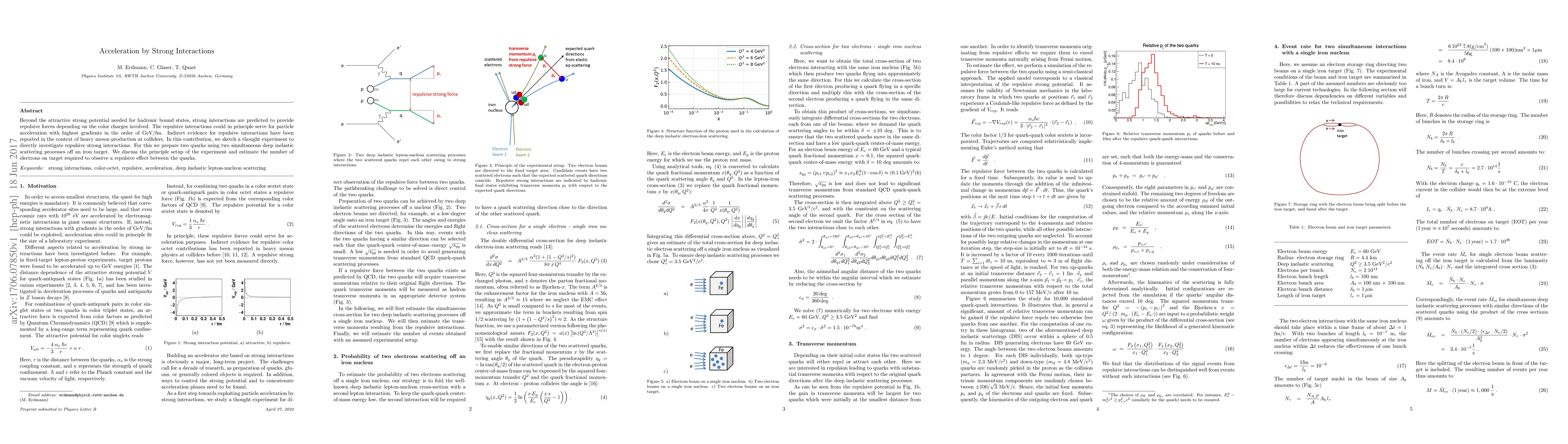 Beyond the attractive strong potential needed for hadronic bound states, strong interactions are predicted to provide repulsive forces depending on the color charges involved. The repulsive interactions could in principle serve for particle acceleration with highest gradients in the order of GeV/fm. Indirect evidence for repulsive interactions have been reported in the context of heavy meson production at colliders. In this contribution, we sketch a thought experiment to directly investigate repulsive strong interactions. For this we prepare two quarks using two simultaneous deep inelastic scattering processes off an iron target. We discuss the principle setup of the experiment and estimate the number of electrons on target required to observe a repulsive effect between the quarks.