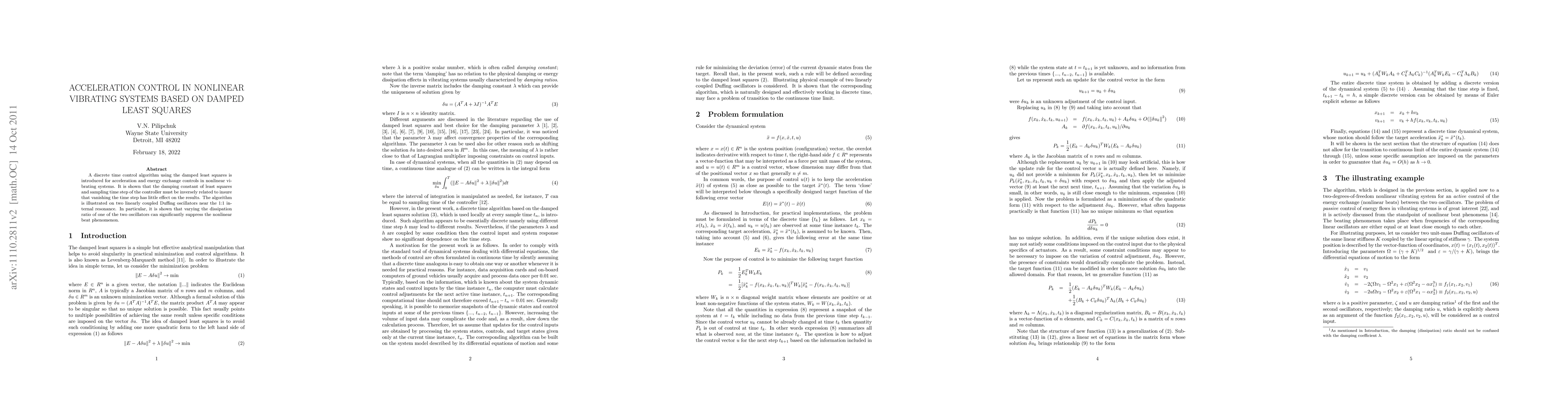 A discrete time control algorithm using the damped least squares is introduced for acceleration and energy exchange controls in nonlinear vibrating systems. It is shown that the damping constant of least squares and sampling time step of the controller must be inversely related to insure that vanishing the time step has little effect on the results. The algorithm is illustrated on two linearly coupled Duffing oscillators near the 1:1 internal resonance. In particular, it is shown that varying the dissipation ratio of one of the two oscillators can significantly suppress the nonlinear beat phenomenon.