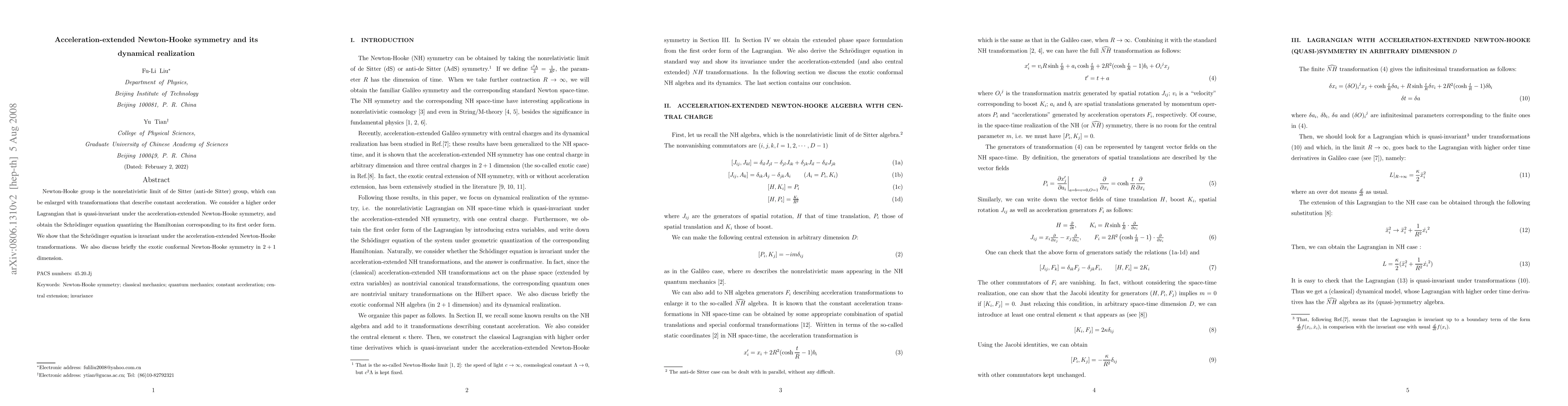This paper explores the extension of Newton-Hooke symmetry to include constant acceleration and central charges, presenting a higher-order Lagrangian that remains quasi-invariant under these transformations. It quantizes the Hamiltonian to derive the Schrödinger equation, which retains invariance under the extended symmetry transformations.