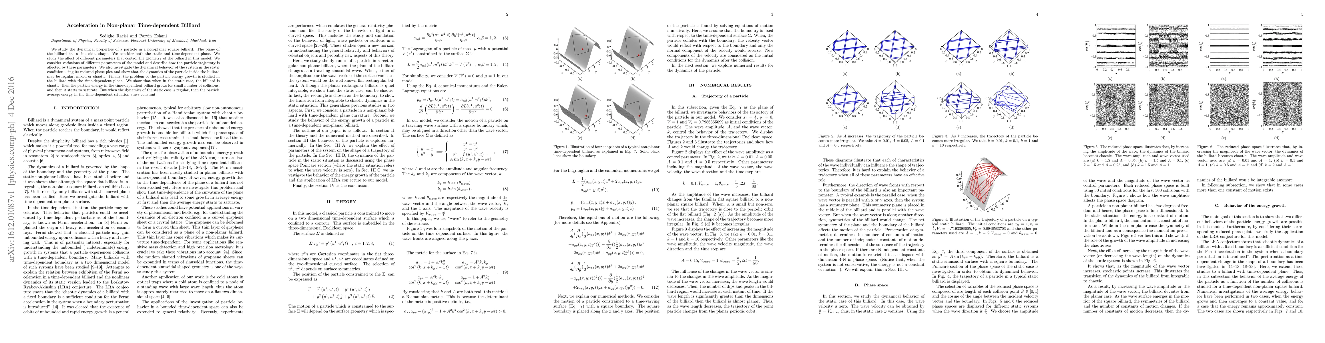 This paper investigates the dynamics of a particle in a non-planar square billiard with a sinusoidal shape, analyzing both static and time-dependent configurations. It explores the effects of geometric parameters on particle trajectories and reveals that the system can exhibit regular, mixed, or chaotic dynamics. The study also finds that energy growth in the time-dependent billiard depends on the static case's dynamics, saturating in chaotic cases and remaining constant in regular cases.