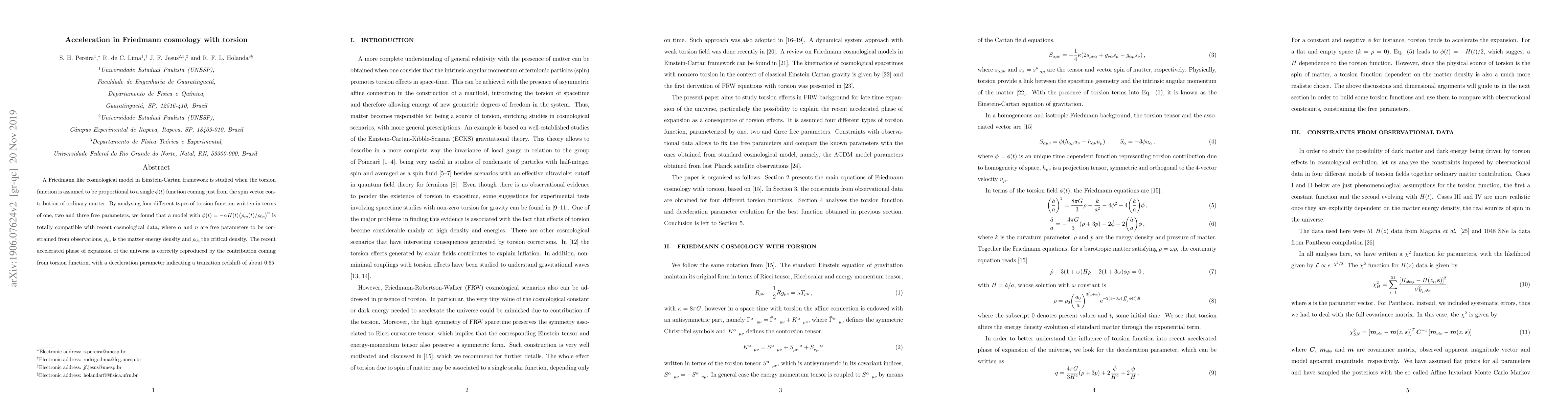 A Friedmann like cosmological model in Einstein-Cartan framework is studied when the torsion function is assumed to be proportional to a single $\phi(t)$ function coming just from the spin vector contribution of ordinary matter. By analysing four different types of torsion function written in terms of one, two and three free parameters, we found that a model with $\phi(t)=- \alpha H(t) \big({\rho_{m}(t)}/{\rho_{0c}}\big)^n$ is totally compatible with recent cosmological data, where $\alpha$ and $n$ are free parameters to be constrained from observations, $\rho_m$ is the matter energy density and $\rho_{0c}$ the critical density. The recent accelerated phase of expansion of the universe is correctly reproduced by the contribution coming from torsion function, with a deceleration parameter indicating a transition redshift of about $0.65$.