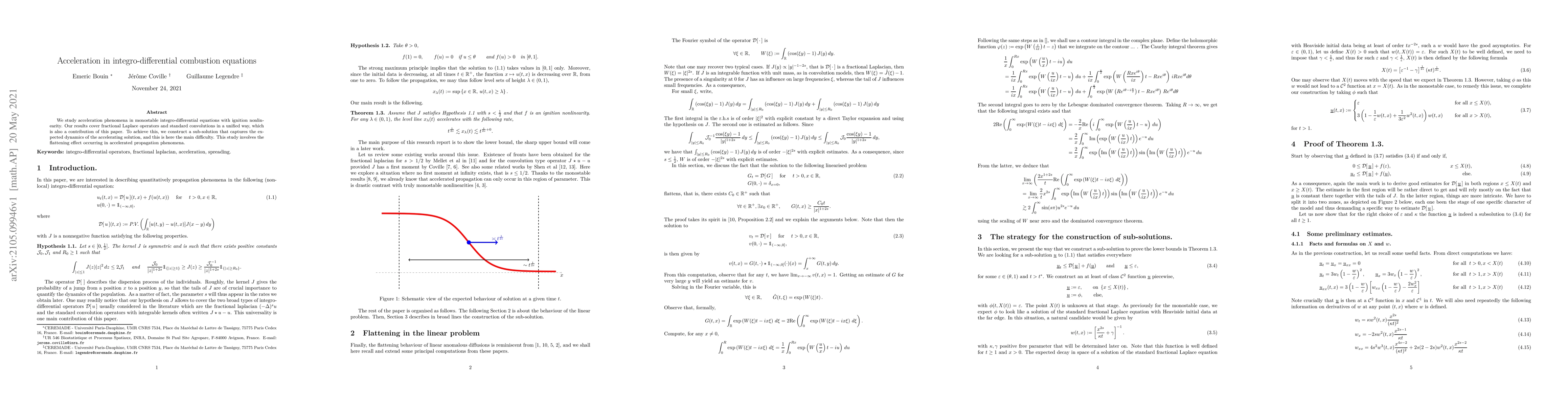 This paper investigates acceleration dynamics in monostable integro-differential combustion equations featuring ignition nonlinearity, employing fractional Laplace operators and standard convolutions. The study constructs a sub-solution to capture the accelerating solution's behavior, highlighting the flattening effect in accelerated propagation.