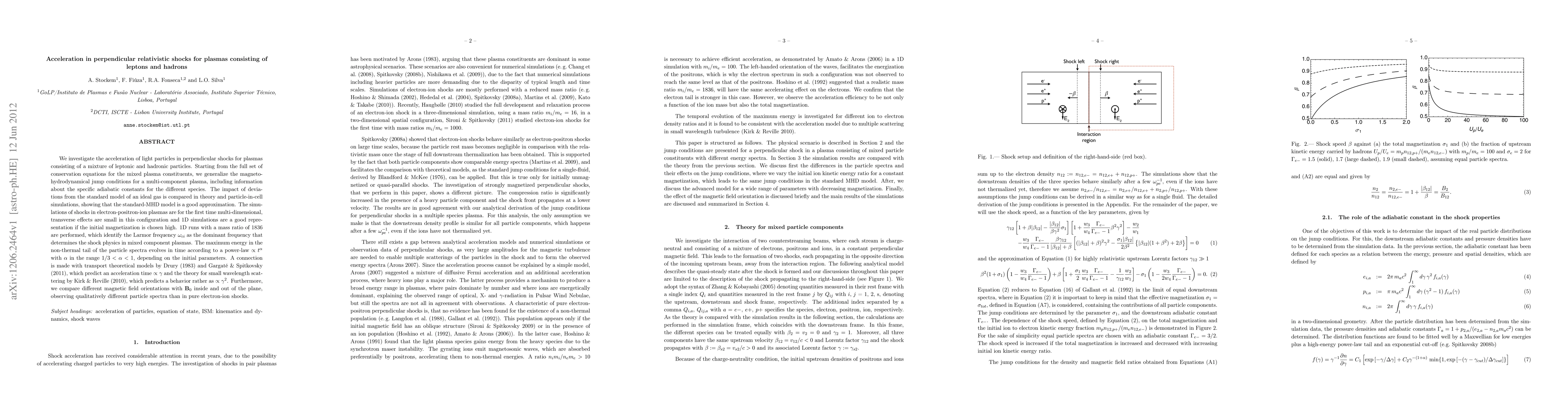 We investigate the acceleration of light particles in perpendicular shocks for plasmas consisting of a mixture of leptonic and hadronic particles. Starting from the full set of conservation equations for the mixed plasma constituents, we generalize the magneto-hydrodynamical jump conditions for a multi-component plasma, including information about the specific adiabatic constants for the different species. The impact of deviations from the standard model of an ideal gas is compared in theory and particle-in-cell simulations, showing that the standard-MHD model is a good approximation. The simulations of shocks in electron-positron-ion plasmas are for the first time multi-dimensional, transverse effects are small in this configuration and 1D simulations are a good representation if the initial magnetization is chosen high. 1D runs with a mass ratio of 1836 are performed, which identify the Larmor frequency \omega_{ci} as the dominant frequency that determines the shock physics in mixed component plasmas. The maximum energy in the non-thermal tail of the particle spectra evolves in time according to a power-law proportional to t^\alpha with \alpha in the range 1/3 < \alpha < 1, depending on the initial parameters. A connection is made with transport theoretical models by Drury (1983) and Gargate & Spitkovsky (2011), which predict an acceleration time proportional to \gamma and the theory for small wavelength scattering by Kirk & Reville (2010), which predicts a behavior rather as proportional to \gamma^2. Furthermore, we compare different magnetic field orientations with B_0 inside and out of the plane, observing qualitatively different particle spectra than in pure electron-ion shocks.