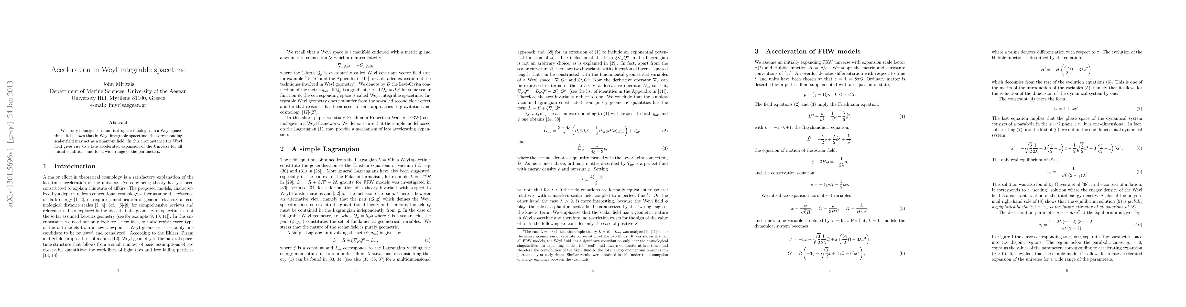 This paper investigates homogeneous and isotropic cosmologies within Weyl integrable spacetime, demonstrating that the Weyl field can behave as a phantom field, leading to a late-stage accelerated expansion of the Universe under various initial conditions and parameter ranges.