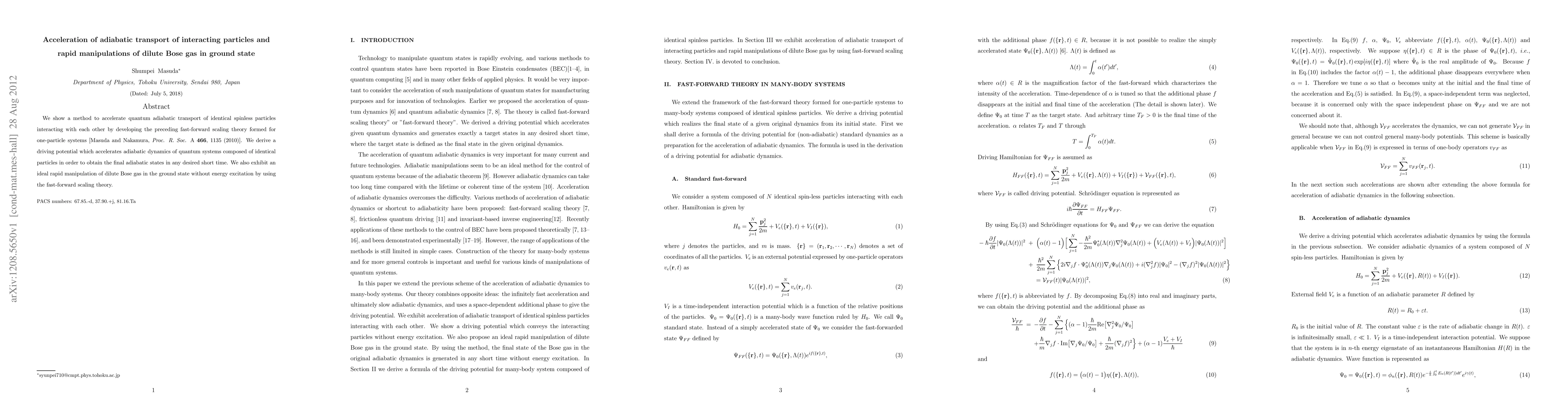 We show a method to accelerate quantum adiabatic transport of identical spinless particles interacting with each other by developing the preceding fast-forward scaling theory formed for one-particle systems [Masuda and Nakamura, {\it Proc. R. Soc.} A {\bf 466}, 1135 (2010)]. We derive a driving potential which accelerates adiabatic dynamics of quantum systems composed of identical particles in order to obtain the final adiabatic states in any desired short time. We also exhibit an ideal rapid manipulation of dilute Bose gas in the ground state without energy excitation by using the fast-forward scaling theory.