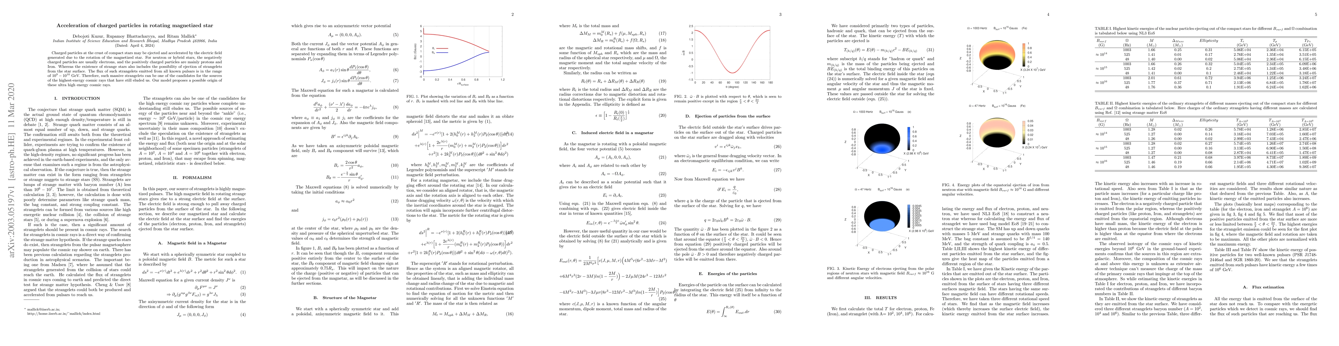 Charged particles at the crust of compact stars may be ejected and accelerated by the electric field generated due to the rotation of the magnetized star. For neutron or hybrid stars, the negatively charged particles are usually electrons, and the positively charged particles are mainly protons and Iron. Whereas the existence of strange stars also includes the possibility of ejection of strangelets from the star surface. The flux of such strangelets emitted from all known pulsars is in the range of $10^9-10^{10}$ GeV. Therefore, such massive strangelets can be one of the candidates for the sources of the highest-energy cosmic rays that have still eluded us. Our model proposes a possible origin of these ultra high energy cosmic rays.