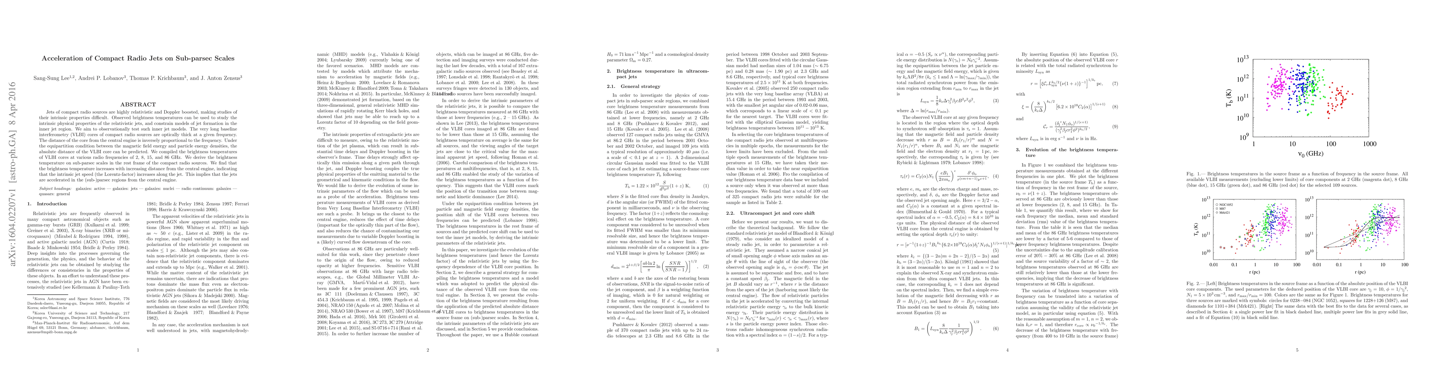 This paper investigates the brightness temperatures of compact radio jets to determine intrinsic jet properties and formation models. Observations show that brightness temperature increases with distance from the central engine, indicating that jets accelerate in the sub-parsec regions near the source.