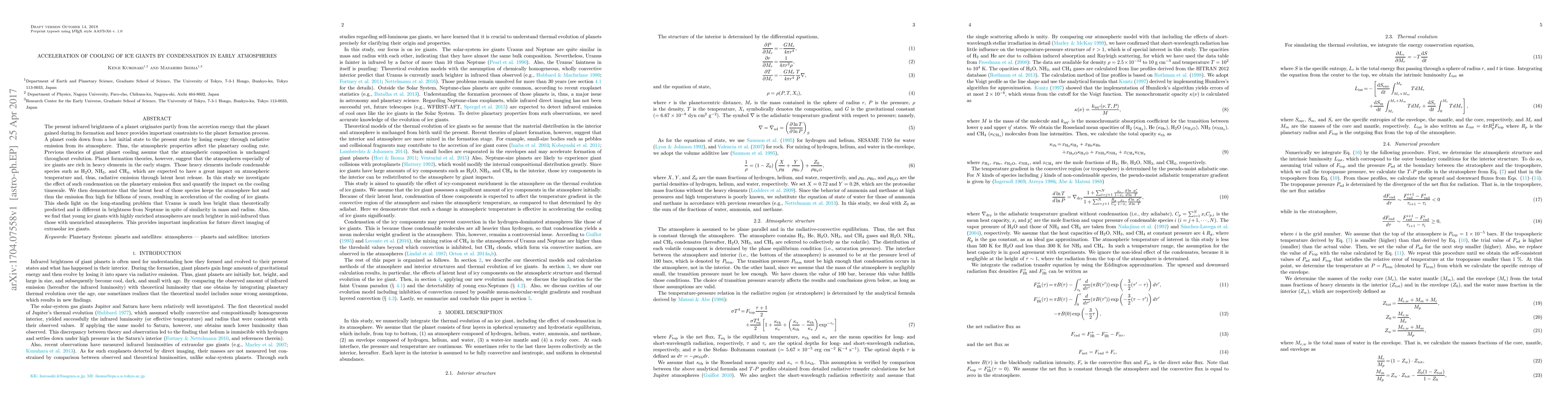 This study investigates the impact of condensation of heavy elements like water, ammonia, and methane in early ice giant atmospheres on their cooling rates. The research finds that latent heat from condensation keeps atmospheres hot and increases emission flux, accelerating cooling. This explains Uranus' lower brightness and offers insights into distinguishing young, enriched ice giants through mid-infrared observations.