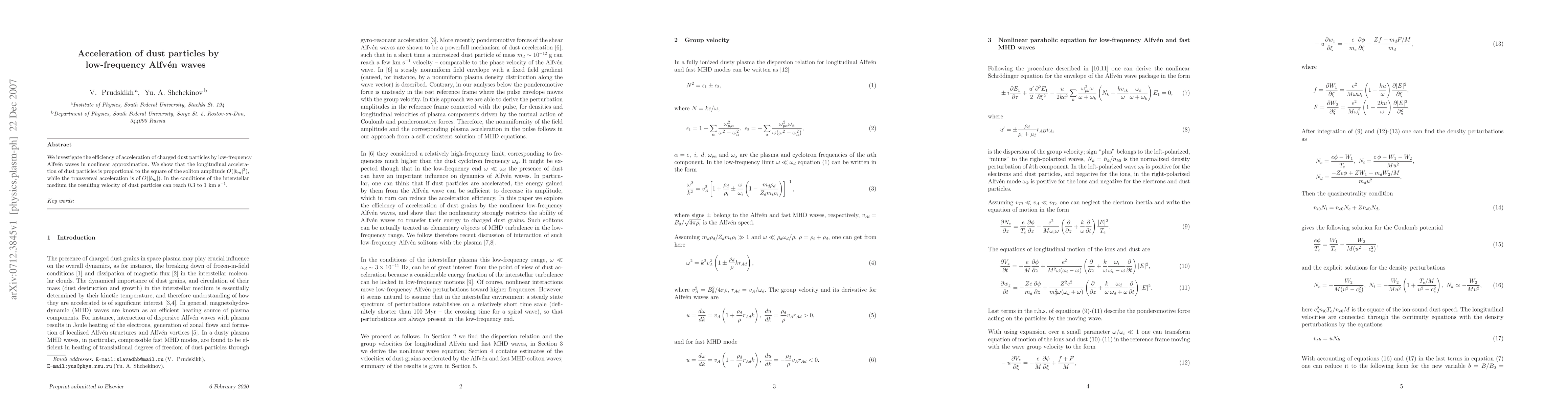 We investigate the efficiency of acceleration of charged dust particles by low-frequency Alfv\'en waves in nonlinear approximation. We show that the longitudinal acceleration of dust particles is proportional to the square of the soliton amplitude $O(|b_m|^2)$, while the transversal acceleration is of $O(|b_m|)$. In the conditions of the interstellar medium the resulting velocity of dust particles can reach 0.3 to 1 km s$^{-1}$.