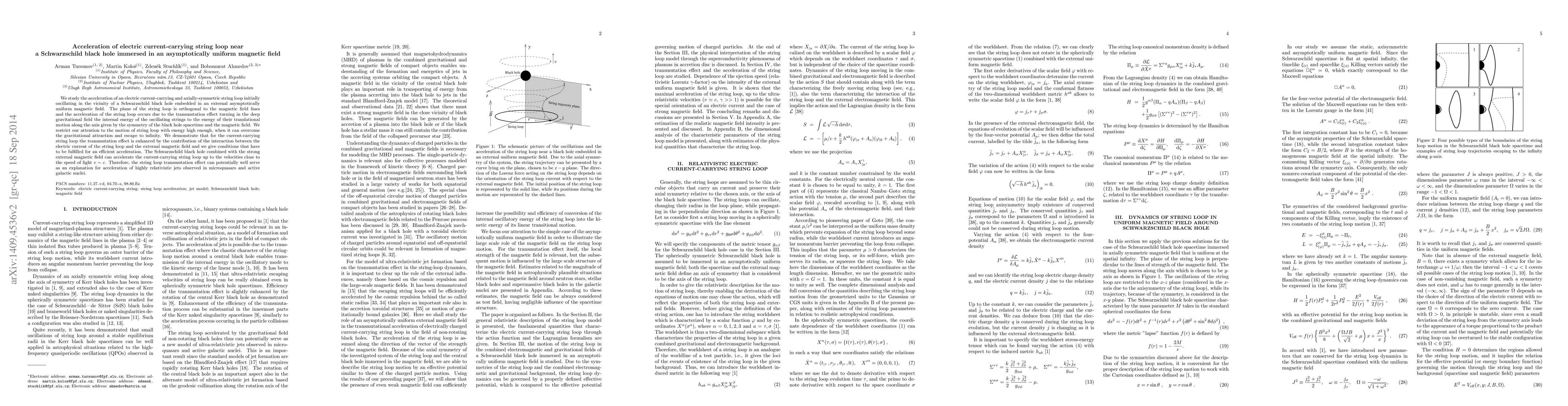 This paper investigates the acceleration of an electric current-carrying string loop near a Schwarzschild black hole in an external magnetic field, demonstrating that gravitational and magnetic interactions can transmute the loop's internal energy to translational motion, potentially accelerating it to relativistic speeds. The study suggests this mechanism could explain the high-velocity jets observed in astrophysical phenomena.