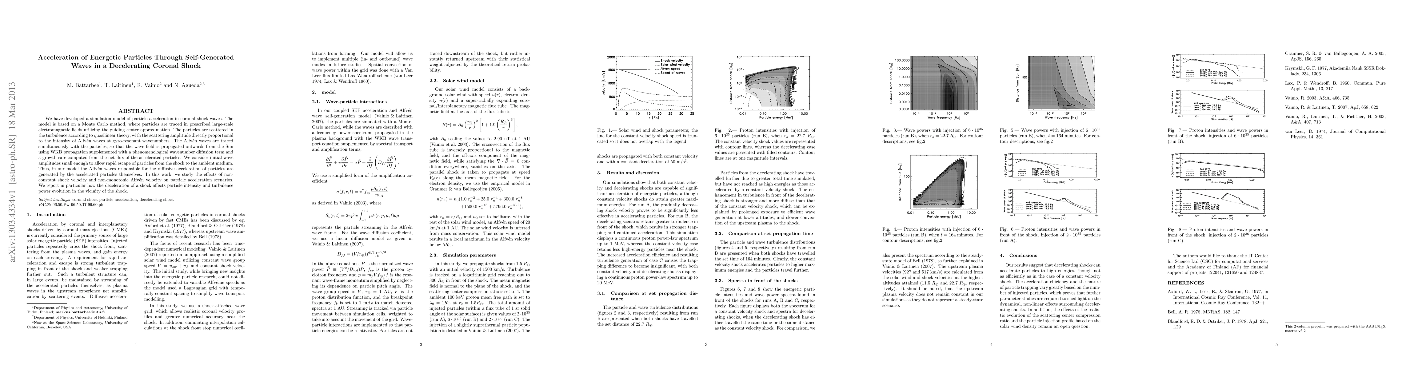 We have developed a simulation model of particle acceleration in coronal shock waves. The model is based on a Monte Carlo method, where particles are traced in prescribed large-scale electromagnetic fields utilizing the guiding center approximation. The particles are scattered in the turbulence according to quasilinear theory, with the scattering amplitude directly proportional to the intensity of Alfv\'en waves at gyro-resonant wavenumbers. The Alfv\'en waves are traced simultaneously with the particles, so that the wave field is propagated outwards from the Sun using WKB propagation supplemented with a phenomenological wavenumber diffusion term and a growth rate computed from the net flux of the accelerated particles. We consider initial wave amplitudes small enough to allow rapid escape of particles from the shock to the ambient medium. Thus, in our model the Alfv\'en waves responsible for the diffusive acceleration of particles are generated by the accelerated particles themselves. In this work, we study the effects of non-constant shock velocity and non-monotonic Alfv\'en velocity on particle acceleration scenarios. We report in particular how the deceleration of a shock affects particle intensity and turbulence power evolution in the vicinity of the shock.