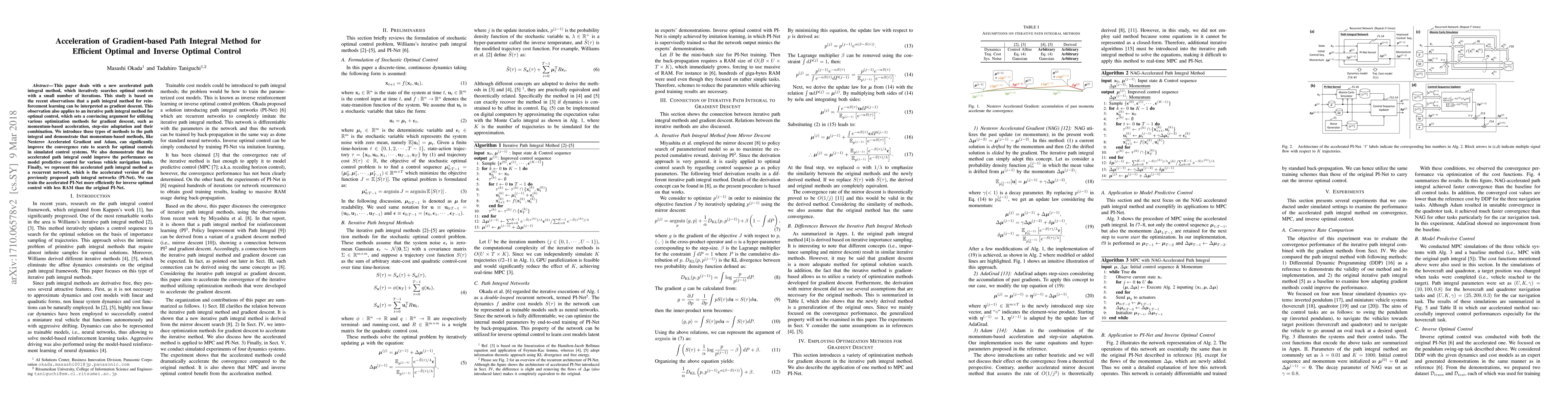 This paper deals with a new accelerated path integral method, which iteratively searches optimal controls with a small number of iterations. This study is based on the recent observations that a path integral method for reinforcement learning can be interpreted as gradient descent. This observation also applies to an iterative path integral method for optimal control, which sets a convincing argument for utilizing various optimization methods for gradient descent, such as momentum-based acceleration, step-size adaptation and their combination. We introduce these types of methods to the path integral and demonstrate that momentum-based methods, like Nesterov Accelerated Gradient and Adam, can significantly improve the convergence rate to search for optimal controls in simulated control systems. We also demonstrate that the accelerated path integral could improve the performance on model predictive control for various vehicle navigation tasks. Finally, we represent this accelerated path integral method as a recurrent network, which is the accelerated version of the previously proposed path integral networks (PI-Net). We can train the accelerated PI-Net more efficiently for inverse optimal control with less RAM than the original PI-Net.