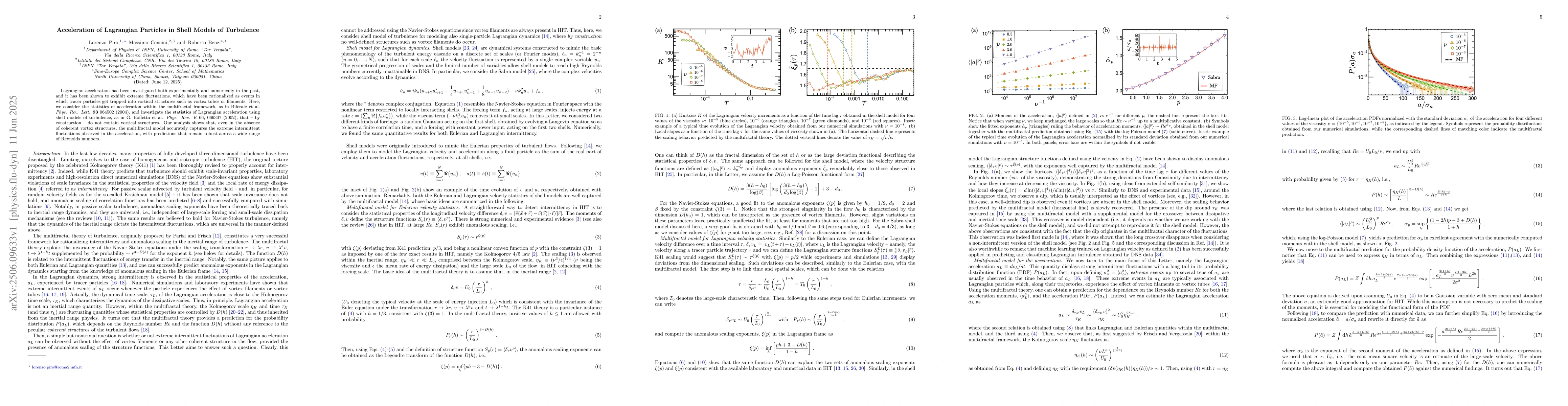 Researchers used shell models of turbulence to study Lagrangian acceleration, finding that a multifractal model accurately captures extreme fluctuations even without vortical structures.