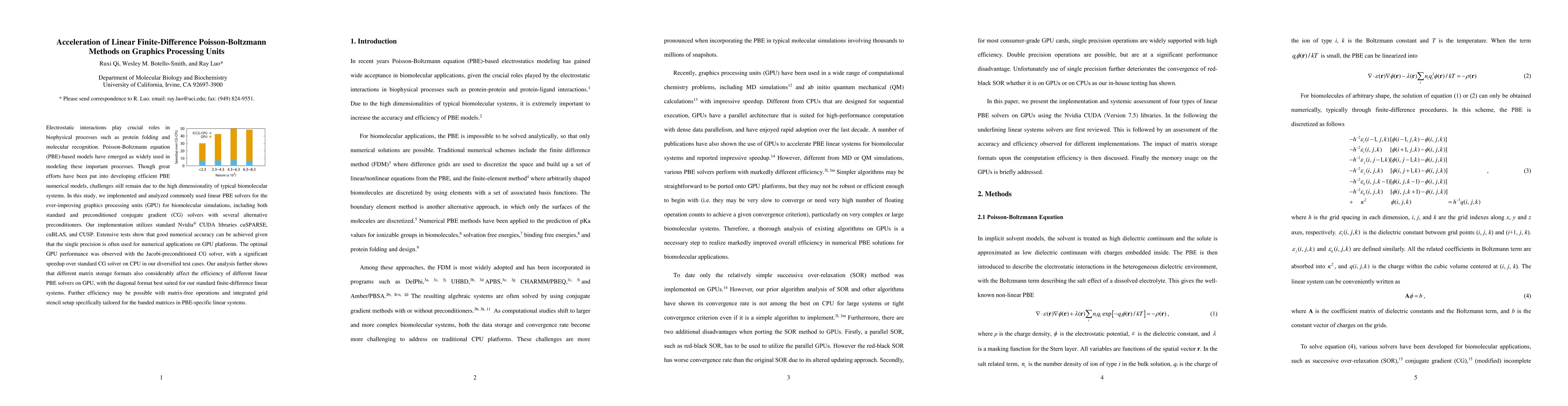 Researchers optimized linear finite-difference Poisson-Boltzmann methods on GPUs for biomolecular simulations, achieving good numerical accuracy with significant speedups over CPU calculations.